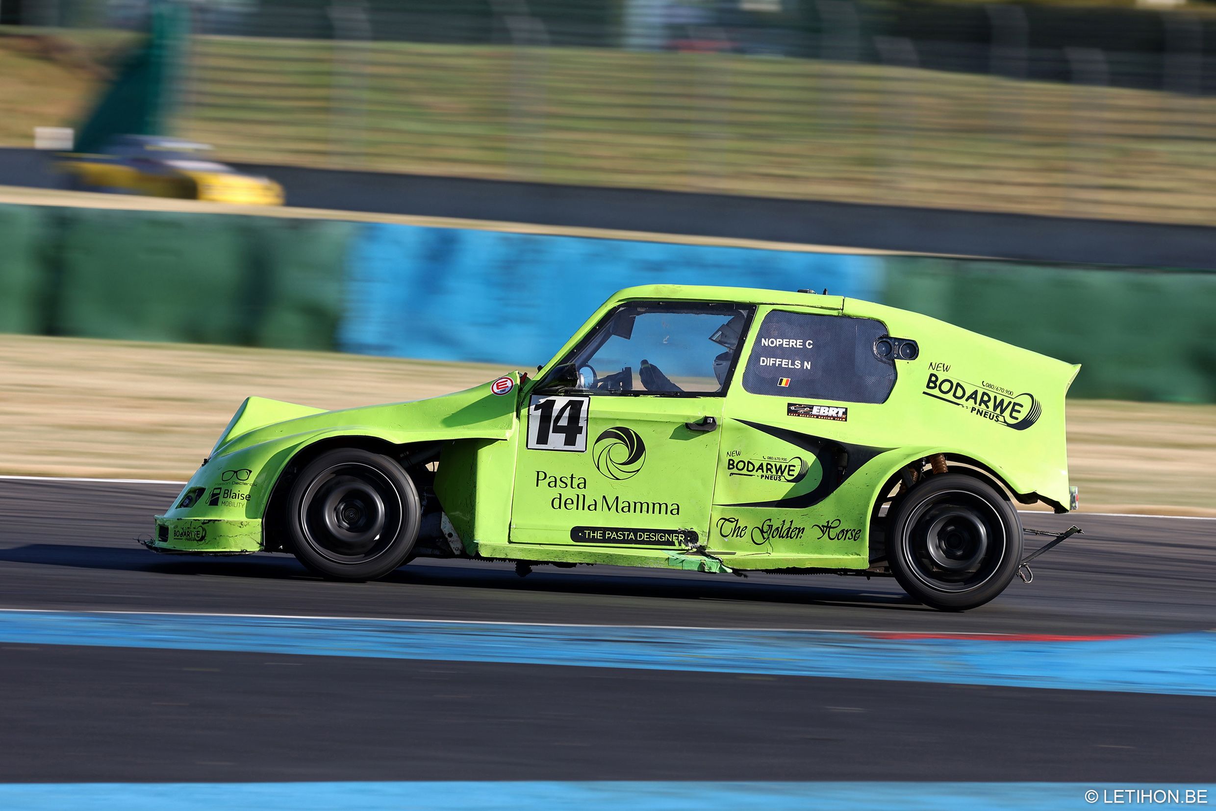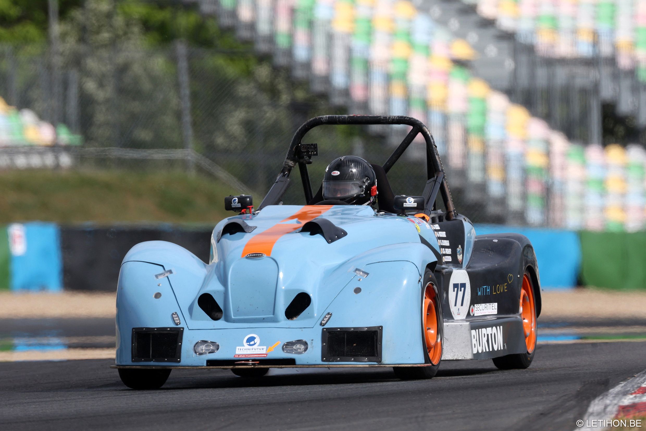 Relevant de la catégorie ‘Xpérimentale’, la Burton #77 alignée par Burton Technifutur Academy a marqué le meeting nivernais de son empreinte. Dès vendredi, lors de la Course 1, le petit bolide piloté par Thierry Marville, David Dahm, Christian Gengoux et Simon Henrard a pris les devants, emmenant dans son sillage les trois ‘Hybrides’ les plus véloces, soit la #14 The Golden Horse I de Clément Nopère et Nathan Diffels, la #18 Trapanelle by 2CV Passion de Guillaume Berteaux, Marc Berteaux, Thierry Ehrhardt et Marvin Herman, mais aussi la #33 P4M de Médhi-Rik Bouchereau, Laurent Bressan et Yves De Kelper. Partie depuis la pitlane, la #16 The Golden Horse II, que se partageaient Jean-Pierre Blaise, Sébastien Piette et Pierre Dupont, ne tardait pas à revenir dans le top 5… avant de laisser filer deux tours en raison d’un souci de roulement !