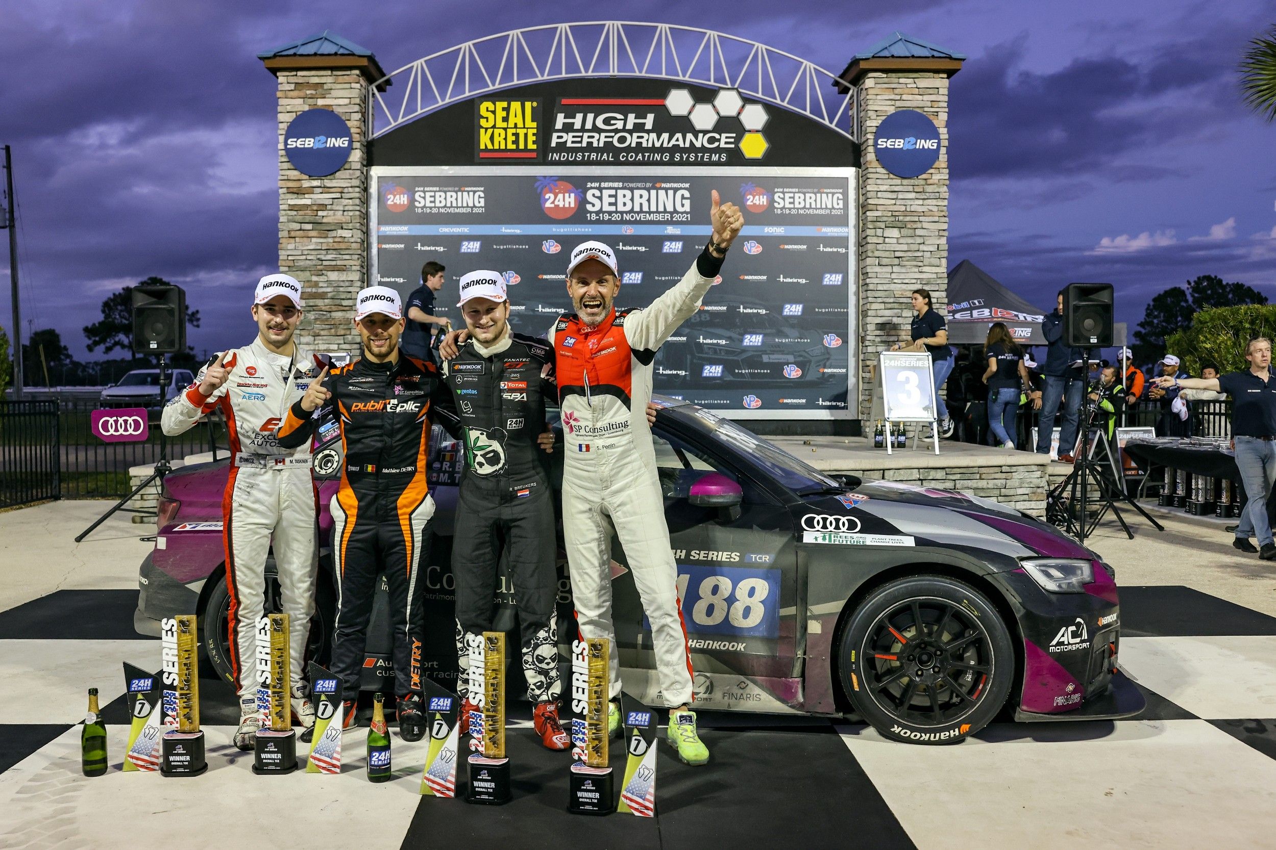 Une fois l’épreuve relancée, l’Audi #188 conservait les devants, sans parvenir à lâcher la concurrence. Peu avant l’arrivée, l’émotion était à son comble lorsque le bolide aux anneaux s’immobilisait furtivement après un ravitaillement en carburant. "J’étais au volant, et il ne fallait pas paniquer, reprend Stéphane. J’ai effectué un ‘reset’ de l’ensemble, et la mécanique s’est relancée. C’est Mathieu qui a eu le plaisir de franchir le drapeau à damier ! Ensuite, c’était Victory Lane, et des étoiles plein les yeux. On a gagné la Division TCE de la première épreuve de 24 heures organisée à Sebring ! Et ça, cela vaut tous les titres ! Un résultat qui confirme que Matthew Taskinen est définitivement notre mascotte. Il n’avait plus roulé depuis Dubaï 2019 et notre dernière victoire en date, et il revient… quand on gagne de nouveau ! Ce jeune Canadien, il faut qu’on le garde à nos côtés…"