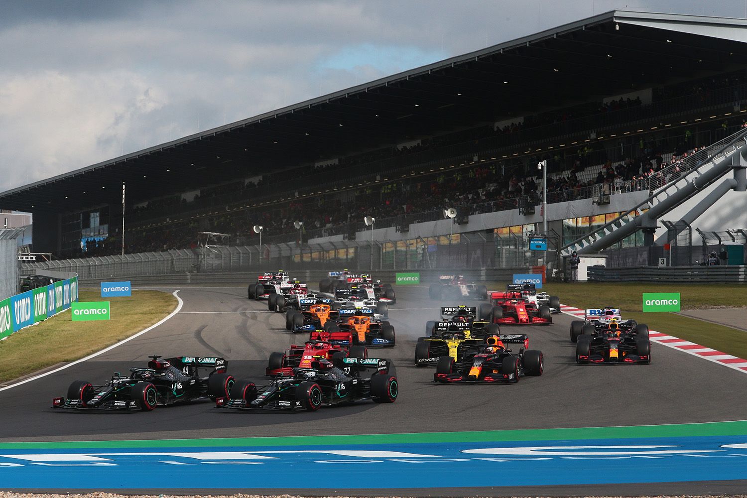 Un peu plus loin, Lando Norris (Mc Laren), longtemps 3ème, perdait lui aussi des chevaux, ce dont profitait Daniel Ricciardo pour signer le premier podium de Renault depuis longtemps (Malaisie 2011). Seul moment tendu pour l’Autralien, son dépassement sur Charles Leclerc (Ferrari), qui ralentissait tout le peloton en début de course. Norris en perdition laissait un duo se bagarrer pour la quatrième place, Leclerc et Perez (Racing Point). Le Mexicain passait une première fois, avant une réaction du Monégasque. Mais la deuxième était la bonne. Sur sa lancée, Perez se lançait à l’assaut de Ricciardo, à 10 secondes devant lui.