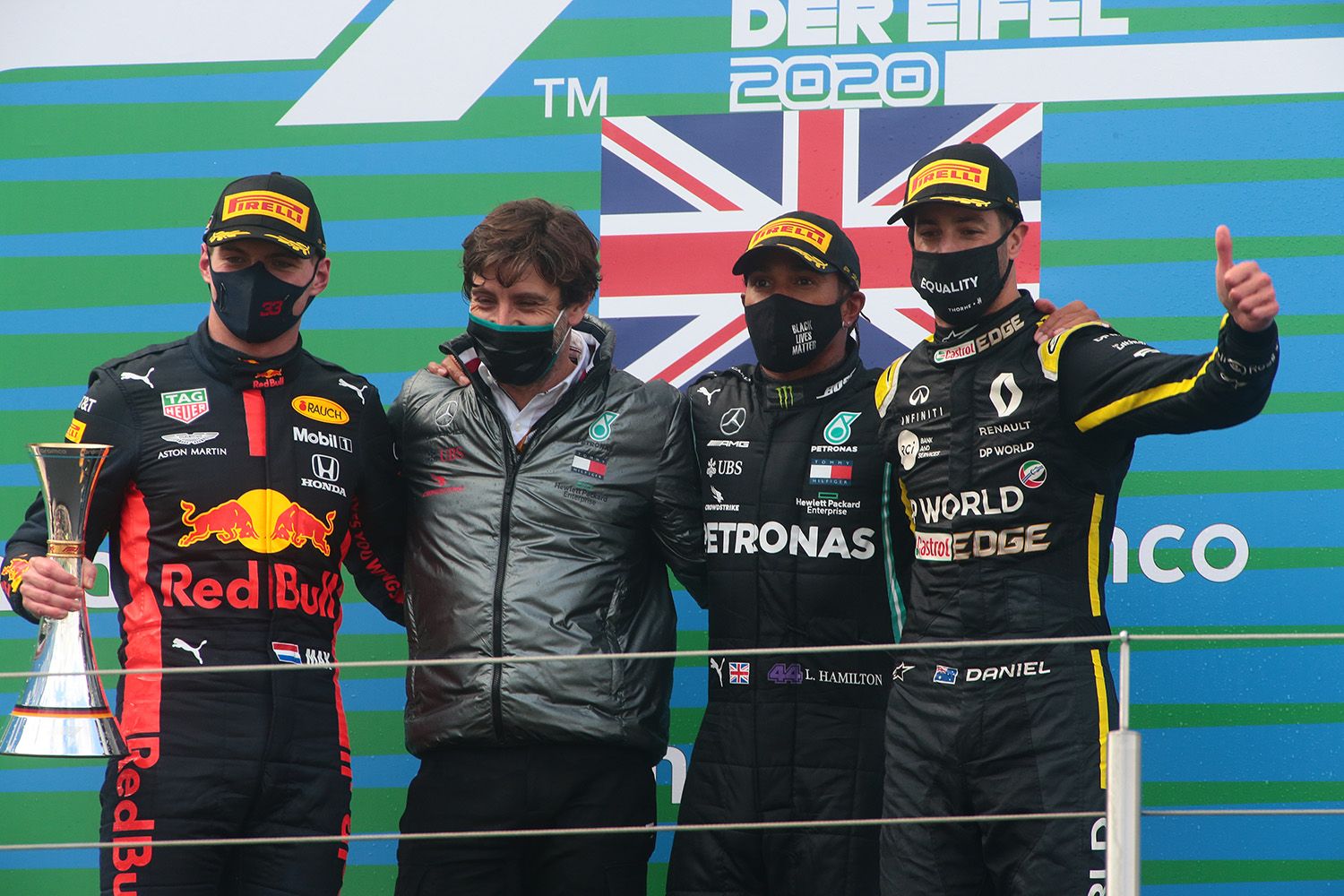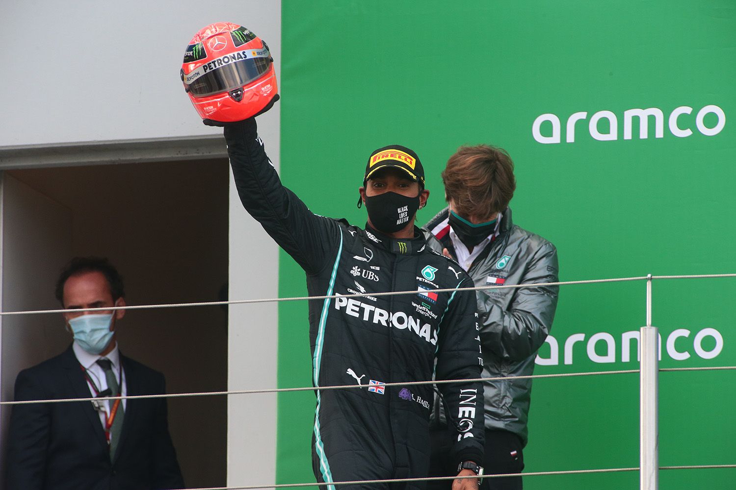 Mais la vedette de la journée s’appellait Lewis Hamilton, qui recevait sur le podium un casque de Mickael Schumacher des mains de son fils, Mick. Une belle passation de pouvoir.