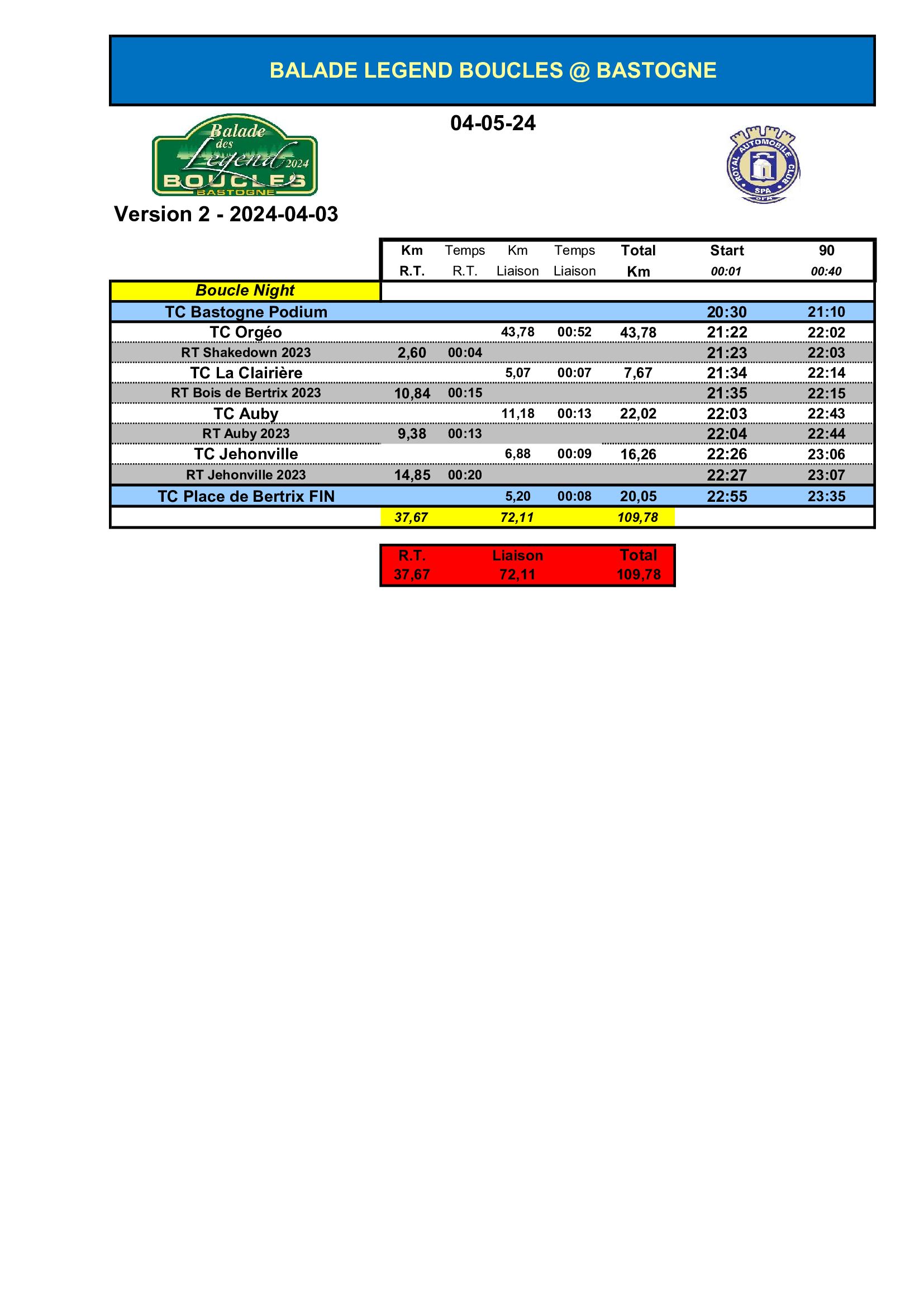 Sur base d'un roadbook d'une totale simplicité, l'objectif sera de relier des RT (spéciales) de l'édition 2024 des Legend Boucles @ Bastogne, mais aussi des tronçons nettement plus anciens. Et pour ceux qui l'ont souhaité, une boucle de nuit, facultative, verra les équipages partir à la découverte des spéciales du Rally of Bertrix 2023.