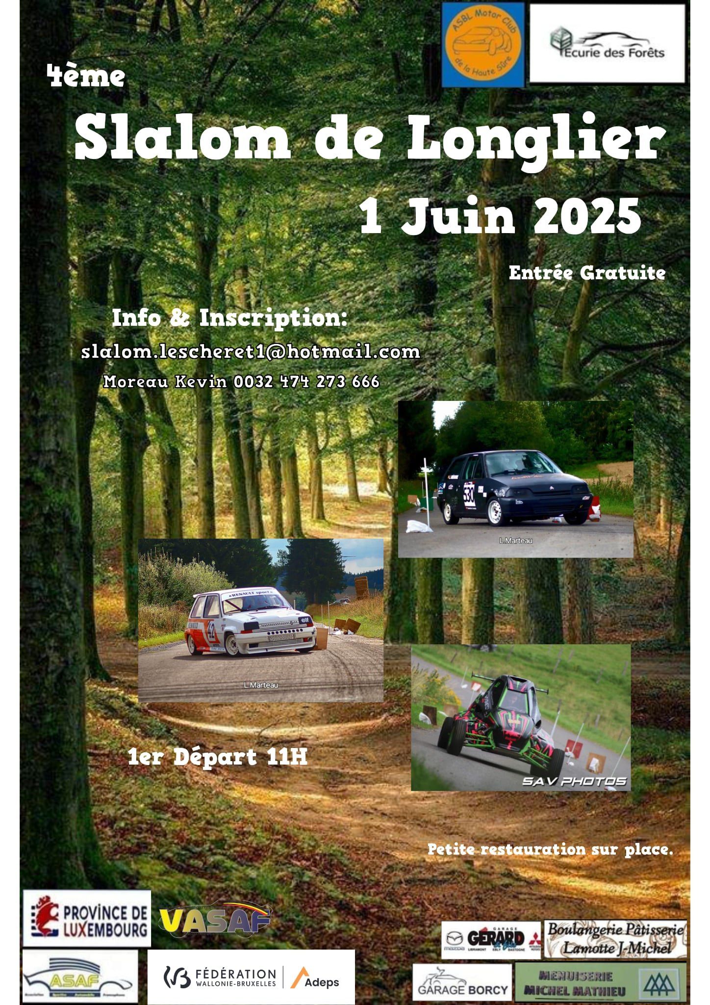 Dans la série des épreuves organisées sous l'égide de l'ASAF aura lieu ce dimanche 1er juin le slalom de Longlier, entrant en ligne de compte pour le championnat VASAF et la compétition ASAF FWB. Le parcours, situé route de la Maladrie, est long de 1300 mètres, avec quatre passages prévus au cours de la journée. Les premiers départs seront donnés à partir de 11h00, après la traditionnelle reconnaissance pédestre. Pas moins de 65 concurrents ont répondu positivement à l'appel du Motor Club de la Haute Sûre, de quoi satisfaire l'organisation.