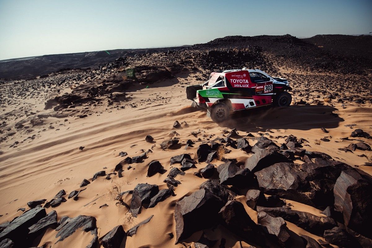 Toyota a planté une nouvelle banderille ce mercredi à l'occasion de l'antépénultième spéciale du Dakar 2021, entre Neom et Al'Ula. les 342 kilomètres contre le chrono ont permis à Yazeed Al-Rajhi d'imposer pour la deuxième fois de la quinzaine son Hilux Overdrive. Et si le Saoudien ne peut plus rien espérer au classement général, tout ce qui est pris est bon à prendre. L'ambiance ne doit cependant pas être à la fête dans le clan Toytota, car si Nasser Al-Attiyah a signé le 2ème meilleur chrono, à 2'04" d'Al-Rajhi, il n'a devancé le leader Stéphane Peterhansel (Mini Buggy) que de... 49 secondes ! A deux étapes de l'arrivée, le Français compte donc toujours 17'01" de bon sur le Qatari, preuve que sa victoire commence à prendre forme.