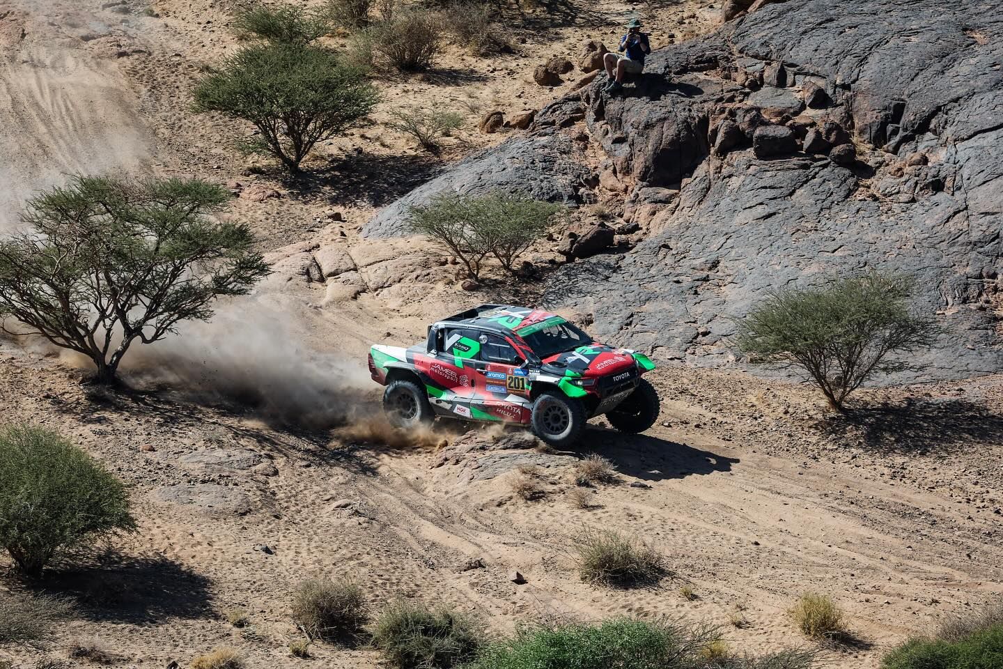 Longue de 415 kilomètres, avant une solide liaison de 175 bornes, l'Etape 4 du Dakar 2025 a une nouvelle fois fait la part belle aux Toyota Hilux ! Pendant que les autres ont perdu beaucoup de temps. Et encore, sans une crevaison dans la partie finale de la spéciale, Yazeed Al-Rajhi (Toyota) aurait pu s'imposer plus largement. Le Saoudien a finalement précédé un Henk Lategan (Toyota), solide comme un roc, de 4'51" ! L'Argentin Juan Cruz Yacopini (Toyota), autre pilote Overdrive Racing, a complété le top 3 à 10'45", précédant un Mathieu Serradori toujours aussi épatant avec son Century C7R à traction intégrale. En dépit d'une pénalité de 20 secondes, il a signé le 6e temps à 14'01", précédé par Martin Prokop (Orlen Ford, 10'55") et Denis Krotov (Mini), meilleur représentant du clan X-raid Team !