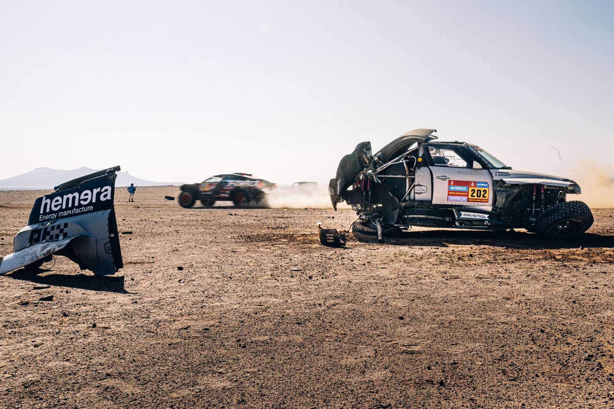 C'est reparti sur le front du Dakar 2025, avec un début de deuxième semaine d'emblée marqué par un fait de course majeur. Après 16 kilomètres seulement dans l'ES6 entre Ha'ïl et Al Duwadimi, Guerlain Chicherit et Alex Winocq sont partis en tonneaux avec leur Mini JCW Rally X-raid Team ! Si l'équipage s'est extrait du bolide endommagé, le pilote français a été emmené en hélicoptère, se plaignant de douleurs cervicales. L'issue d'une première partie d'épreuve bien compliquée pour ce duo, comme pour l'ensemble de l'équipe X-raid. (V.F. / Photo Simon Bauchau)
