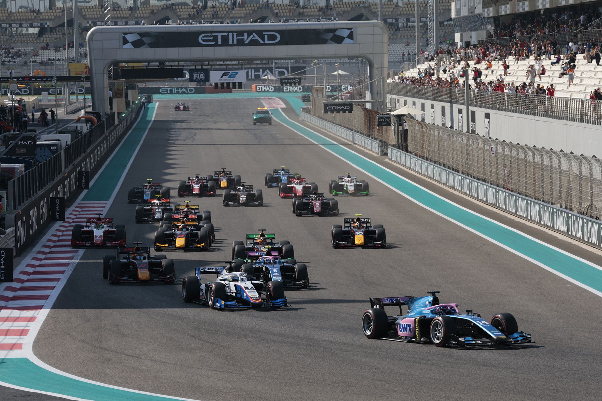 C’était jour de titre, ce matin à Abu Dhabi entre Théo Pourchaire (Art GP) et Frederik Vesti (Prema), séparés par 16 points à l’extinction des feux de cette dernière course longue de F2 de la saison 2023. C’était aussi l’occasion pour le reste du peloton de se mettre en évidence avant la pause hivernale. Notamment Jack Doohan (Virtuosi) et Victor Martins (ART GP), qui se partageaient la première ligne. Sur deux stratégies différentes (softs / mediums pour Doohan, l’inverse pour Martins), les deux hommes ont réalisé une course parfaite pour se retrouver 33 tours plus tard dans le même ordre sous le drapeau à damier.