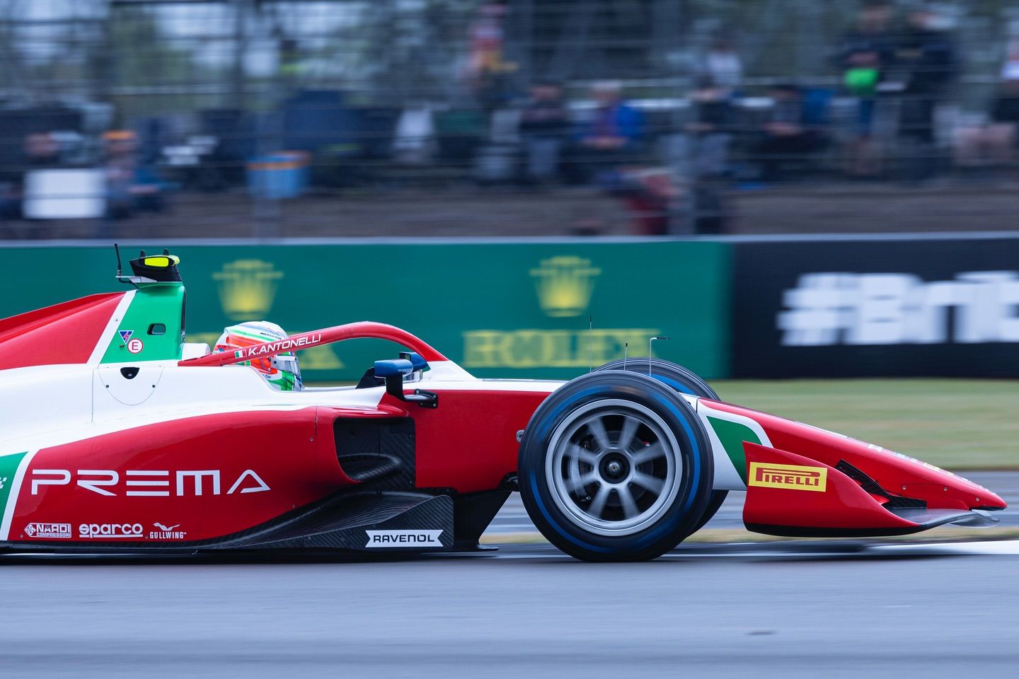 Avec la pluie et l’humidité ambiantes, la prudence était de mise, côté direction de course, au moment de lancer la course sprint de Formule 2 ; d'où un départ lancé pour les 22 concurrents. Une aubaine pour Antonelli (Prema) qui menait le peloton devant Maloney (Rodin) et Maini (Invicta). Suivaient Bortoleto (Invicta), venu à bout de Crawford (DAMS), Colapinto (MP Motorsport), Hauger (MP Motorsport), et Martins (ART GP).
