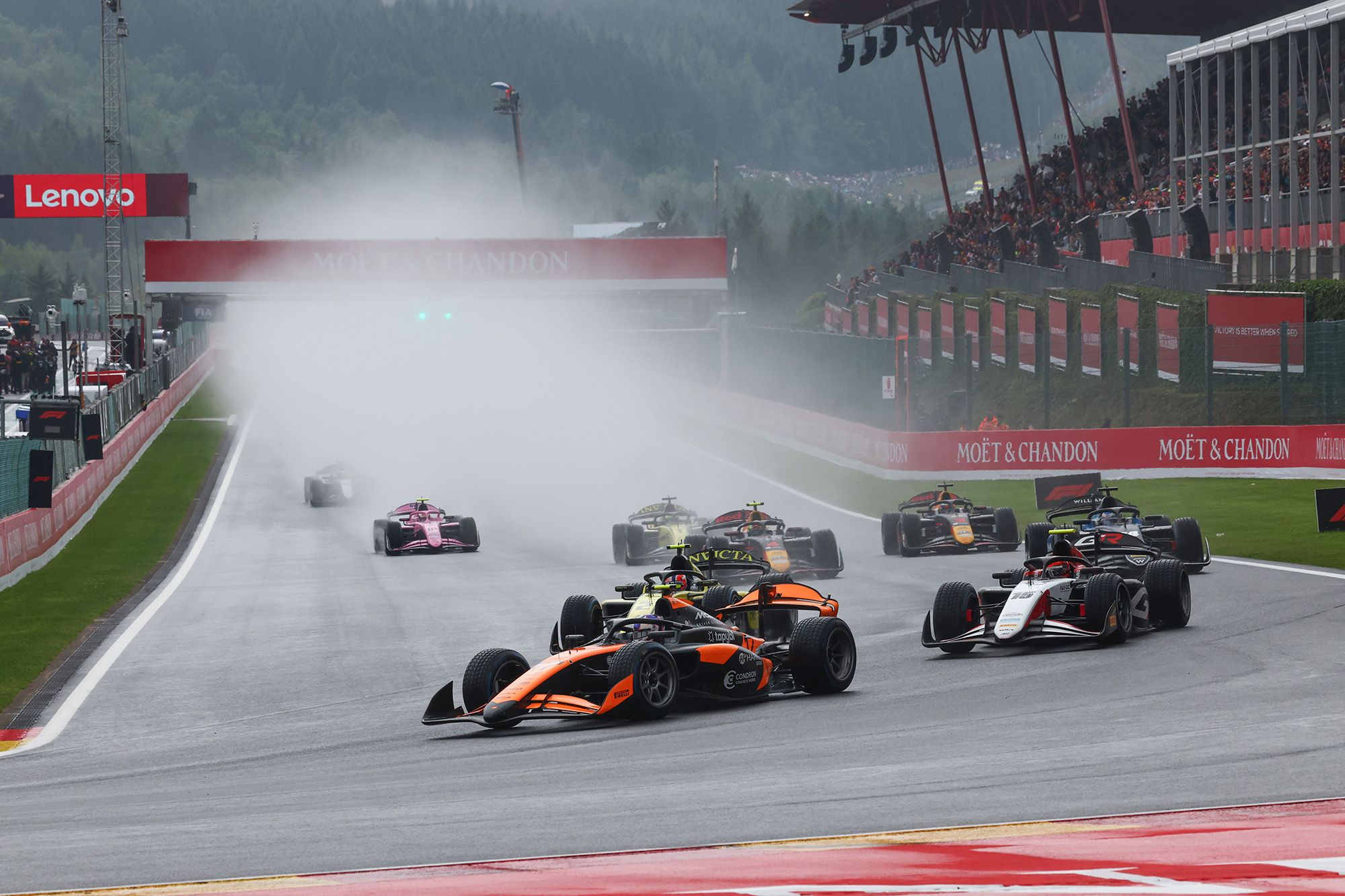 Comme en F3, la pluie était au rendez-vous de la course longue de Formule 2. Heureusement un peu moins forte, ce qui permettait de lancer l’épreuve après trois tours de formation derrière la Safety Car. Logiquement, Alex Dunne (Rodin), en pole position, réussissait à virer en tête devant Stanek (Invicta), Miyata (ART GP), Martins (ART GP), Lindblad (Campos) et le reste du paquet. Le Japonais reprenait cependant rapidement la deuxième place quand Stanek passait au large dans le Raidillon.