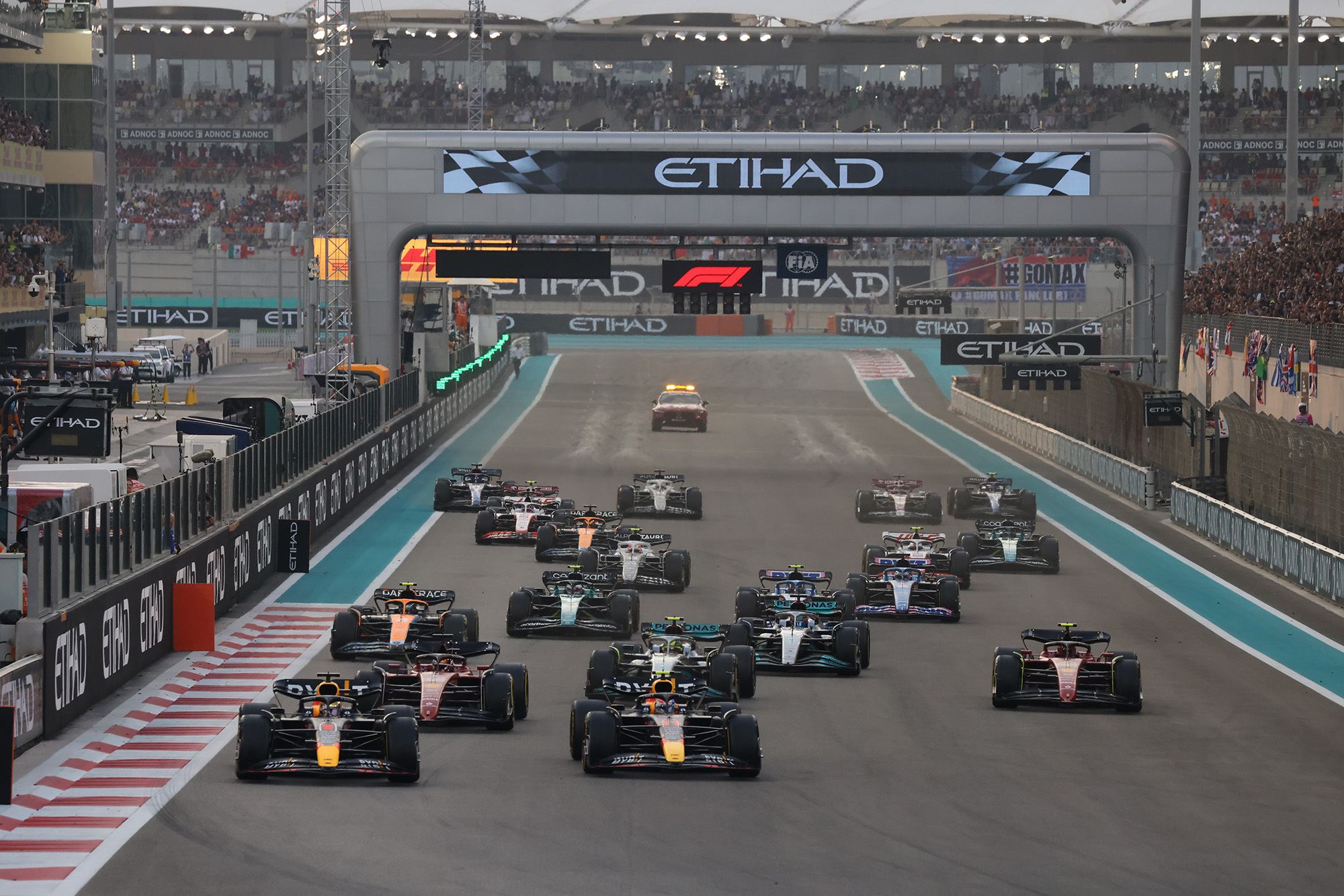Le dernier départ de la saison, à Abu Dhabi, sur le circuit de Yas Marina, se passait sans encombre. Perez essayait bien de déborder son leader mais Verstappen gardait sa pole. Dans le premier passage dans l’épingle, Leclerc (Ferrari), 3ème, était tout près d’attaquer le Mexicain. Le premier incident était pour le bout de la première longue ligne droite quand, juste derrière, Leclerc, Sainz (Ferrari) attaquait Hamilton (Mercedes), bien parti. L’Espagnol écartait l’Anglais dans le run-off, la Mercedes décollait un peu, mais conservait sa 4ème place. Derrière ce duo, suivaient Russell (Mercedes), Norris (McLaren), Ocon (Alpine), Vettel (Aston Martin) et Alonso (Alpine), pour compléter le top 10.