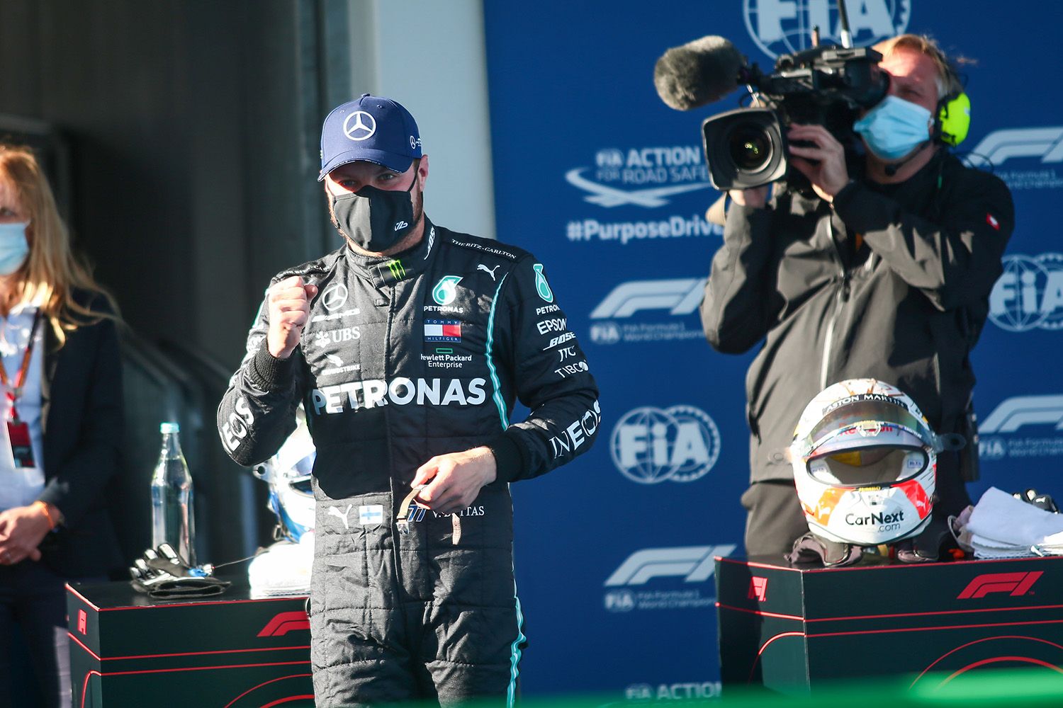 Verstappen, Hamilton et Bottas se retrouvaient une nouvelle fois en lice pour la pole en Q3. Le Néerlandais était le premier à dégainer, mais il était débordé sous le drapeau à damier par Hamilton et surtout Bottas, qui, en affichant tous les secteurs en violet, décrochait sa troisième pole de la saison – la 14ème de sa carrière. Au passage, le record du Nurburgring avait évidemment explosé en 1’25’’269. Hamilton et Verstappen étaient relégués à presque 3 dixièmes.