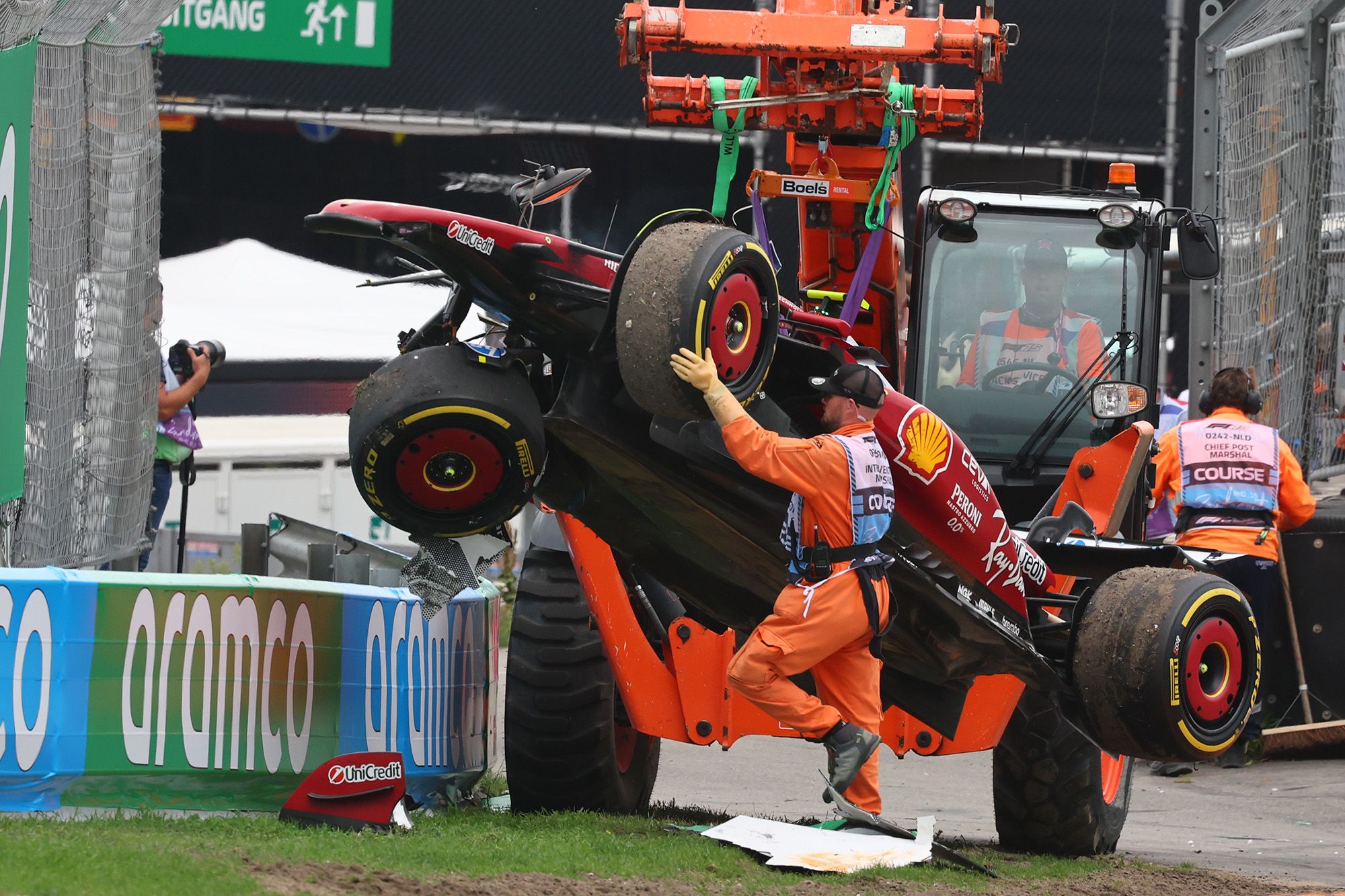 Au 20e tour, alors que la pluie arrivait enfin au-dessus du circuit, notamment dans la ligne droite, mais sans conséquence apparente, l’écart était retombé à trois secondes. Deux boucles plus tard, Leclerc était le premier du groupe de tête à stopper pour monter des gommes slicks dures. Mauvaise pioche pour le Monégasque et Ferrari puisque juste après, Hamilton perdait le contrôle de sa monoplace dans la Parabolique et se voyait contraint à l’abandon ; entrainant logiquement la sortie de la Safety-Car.