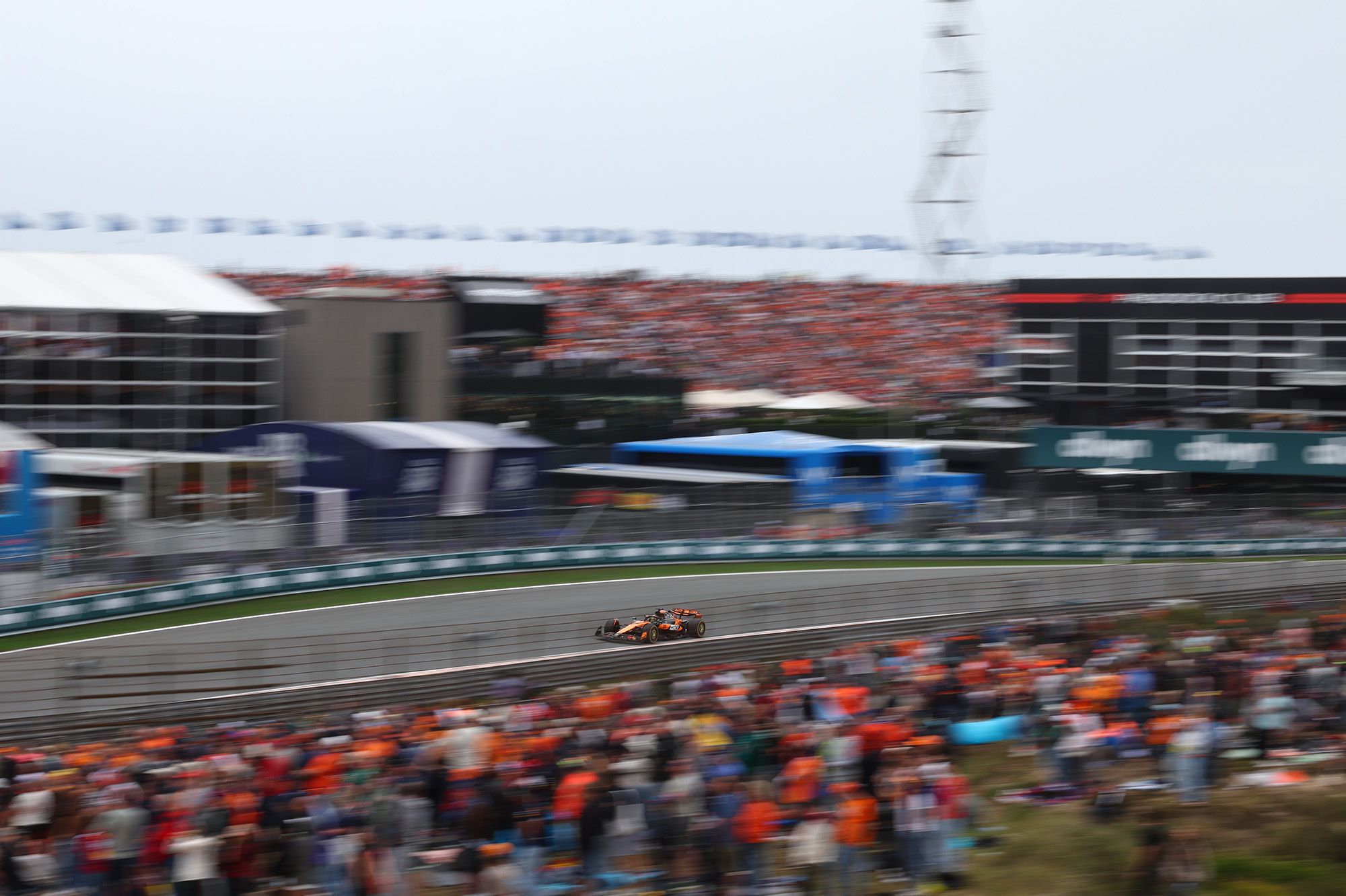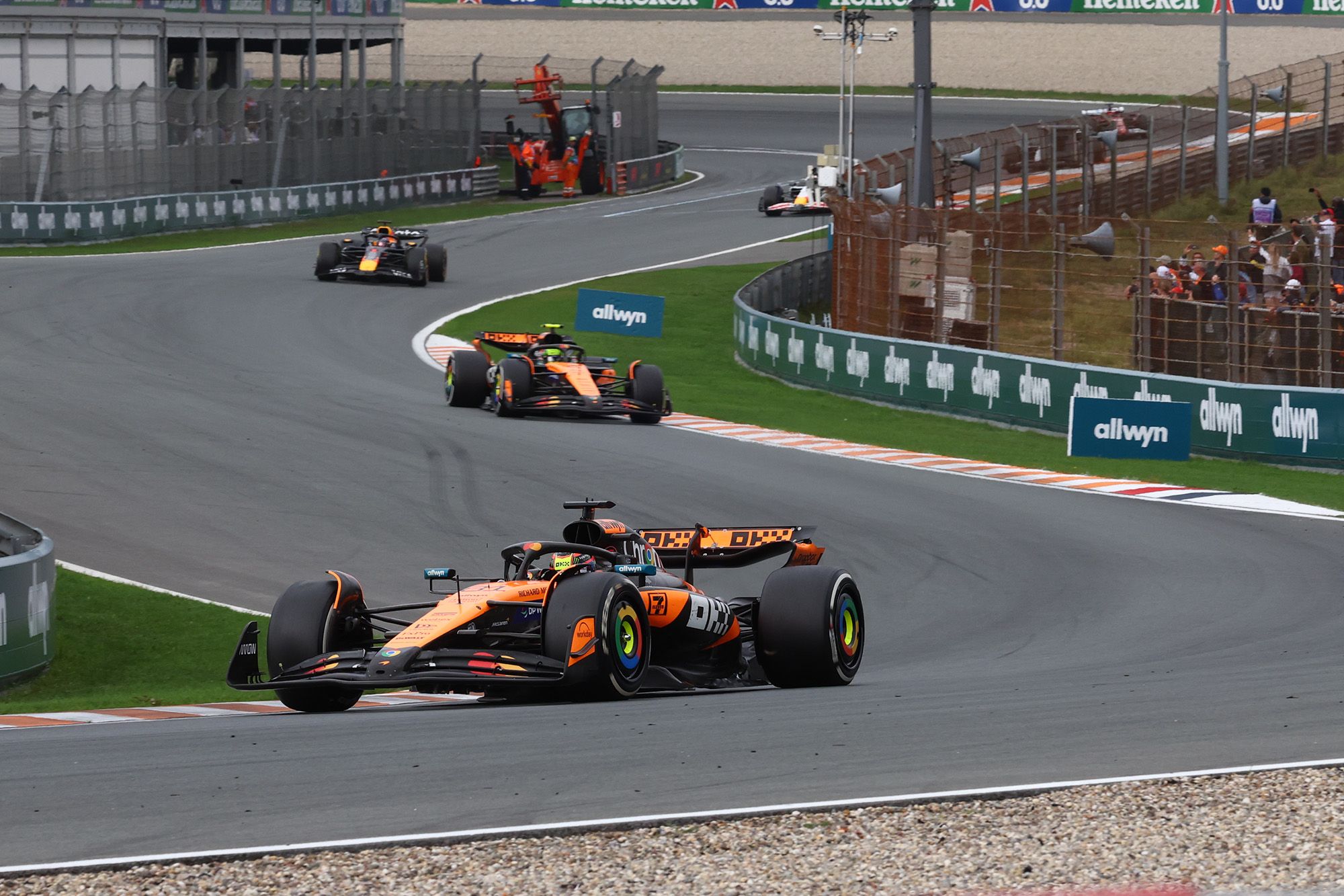 Les McLaren d’Oscar Piastri, le poleman, et de Lando Norris en mediums et la Red Bull de Max Verstappen en tendres : le départ du Grand Prix des Pays-Bas, 15e manche de la saison 2025, s’annonçait des plus prometteurs, le tout sous un ciel très chargé. A l’extinction des feux, Norris partait un soupçon mieux que Piastri, mais l’Australien fermait aussitôt la porte. Une action qui profitait à Verstappen qui se plaçait dans les roues des deux McLaren. Le Néerlandais ne trouvait pas la faille dans la première courbe, mais attaquait Norris dans le deuxième virage. En survitesse à l’extérieur, le champion du monde en titre débordait l’Anglais ; il manquait perdre le contrôle à l’approche de la Parabolique, mais parvenait cependant à conserver sa Red Bull sur la piste et passait en deuxième position.