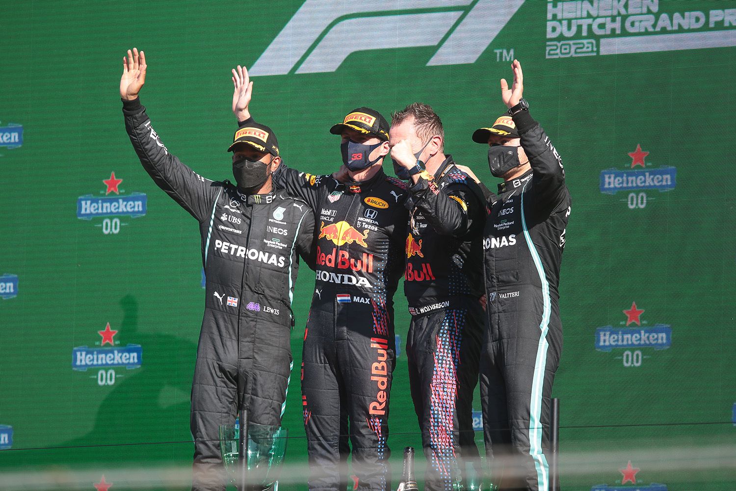 A deux reprises, aux 21ème et 40ème tours, Mercedes a essayé de mettre la pression sur Red Bull en tentant l’undercut avec Hamilton, mais à chaque fois l’écurie autrichienne réagissait en arrêtant Verstappen. Valtteri Bottas en profitait pour rouler quelques tours en tête, mais s’il espérait bloquer le héros local, le Finlandais ne pouvait pas résister longtemps à Verstappen qui trouvait rapidement la faille pour reprendre son bien.