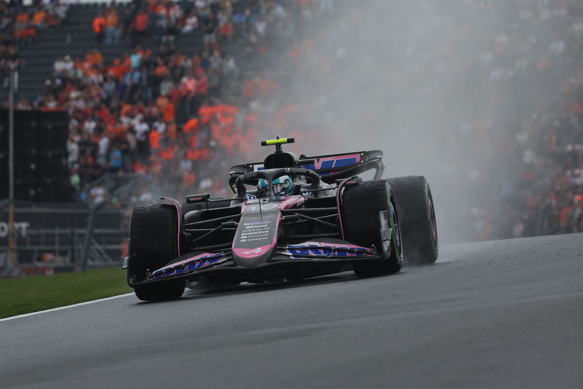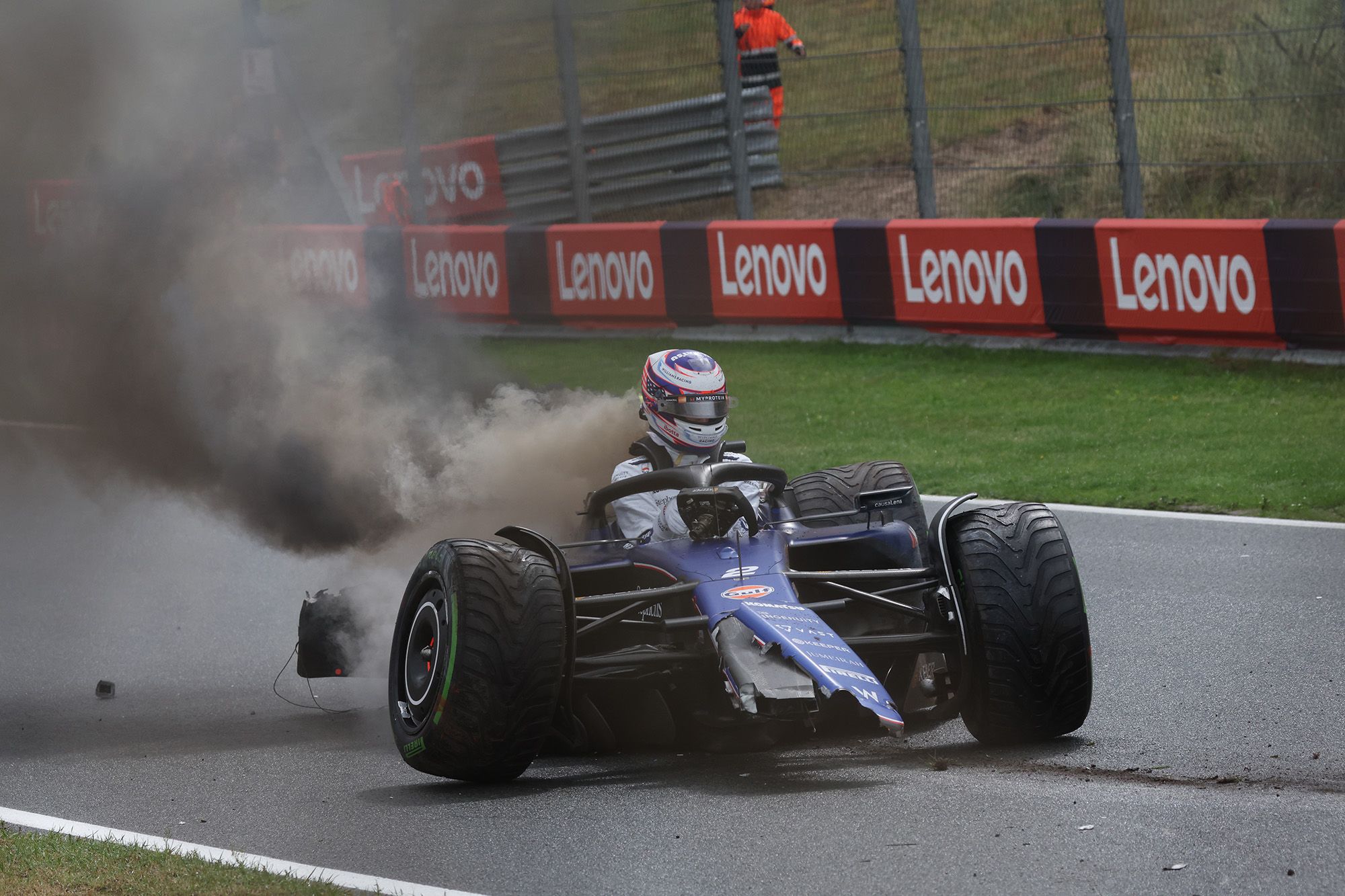 Ce n’était rien à comparer avec l’énorme crash de Logan Sargeant (Williams) après 15 minutes d’essais qui, en roulant dans l’herbe détrempée à la sortie de la Parabolique du virage 3, perdait le contrôle de sa monoplace et l’envoyait violemment dans le rail opposé. Williams en pièces détachées, en flamme côté moteur, rail endommagé, le drapeau rouge était évidemment de sortie et pour un long moment.
