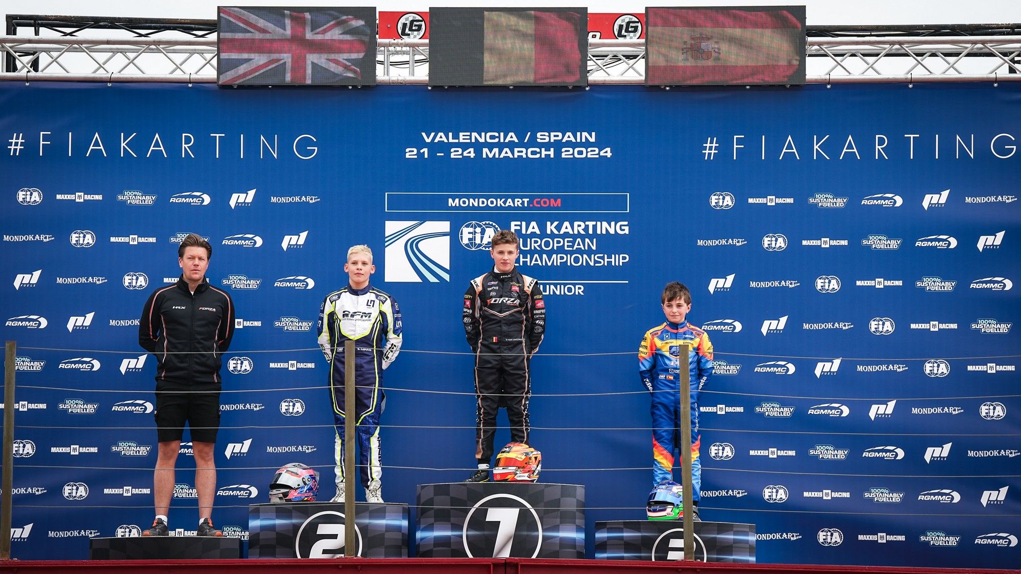 Dries Van Langendonck s’est offert une magnifique victoire ce week-end : sur le circuit de Valencia, le jeune Limbourgeois a remporté la Finale de la manche d’ouverture du Championnat d’Europe OK-Junior de la CIK-FIA ! "Je suis si heureux d’avoir gagné cette course à suspense et d’avoir atteint mes objectifs, s’exclame le Champion du monde 2023. Le départ depuis la deuxième position et la ligne extérieure a été délicat à négocier. Je me suis fait enfermer par moments, j’ai perdu des positions et il m’a fallu quelques tours pour sortir du groupe de poursuivants. J’ai ensuite tout donné pour revenir sur le leader Niklas Schaufler et pour le dépasser au bon moment. L’effort a été vraiment intense, mais tellement grisant ! Moteur, châssis, réglages : tout a très bien fonctionné durant cette épreuve et cela procure énormément de confiance pour les prochains rendez-vous."