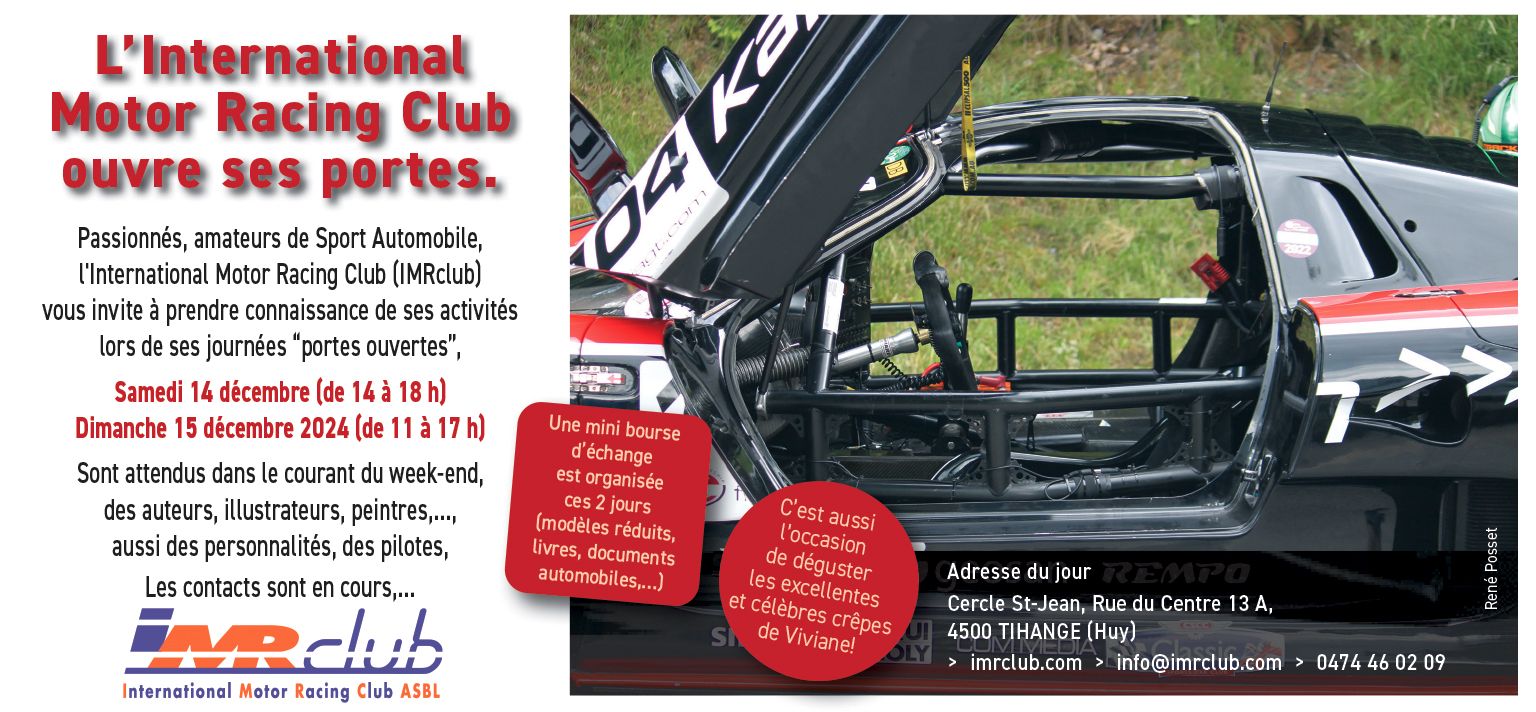 Le traditionnel week-end 'portes ouvertes' de l’IMRclub, c’est ce prochain week-end à Tihange (Huy), à l’ombre des tours (ou pas loin…). A quoi peuvent s’attendre les nombreux visiteurs attendus lors de ces deux journées ? A une ambiance très conviviale entre passionnés et amateurs de sport automobile. A des rencontres avec des pilotes anciens et actuels, diverses personnalités, des auteurs d’ouvrages sur le sport automobile, des artistes, etc. Il y aura certainement des surprises, mais sont annoncés, entre autres, 'Christine' Beckers, Willy Braillard, Hervé Regout, Christian Delferier, Ugo De Wilde et d'autres jeunes suivant leur disponibilité.
