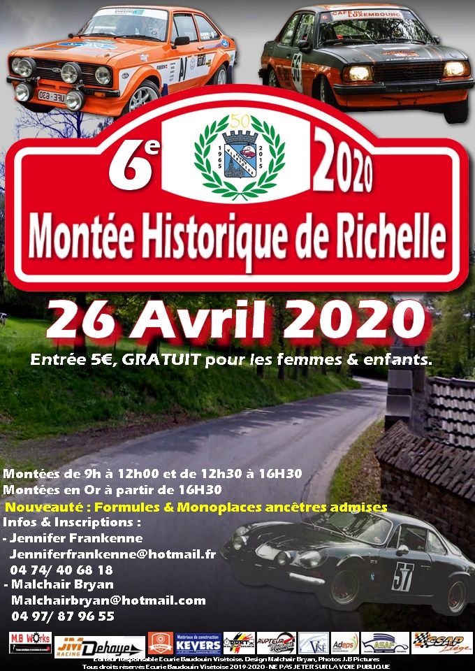 Organisée par l'Ecurie Baudouin Visétoise, la Montée Historique de Richelle vivra sa 6ème édition le dimanche 26 avril. Avec près d'une centaine de concurrents en 2019, la côte s'élançant du bord de Meuse vers le Château de Richelle plaît aux amateurs d'anciennes, qui ont pu y réaliser jusqu'à 7 montées en mode 'Démo'. Pour ce millésime 2020, les protos et monoplaces du temps d'avant sont aussi acceptés, chose rendue possible par l'excellente qualité de l'asphalte. En une semaine à peine, une cinquantaine de pré-inscriptions a déjà été enregistrée, de quoi assurer la présence de gaillards comme Michaël Jassogne, Steve Fafra, Bernard Cornet, Tony Kevers, Olivier Chatelain, Christian Fortemps, Sébastien Graux, Jean-François Gilles, Lionel Junius, Jean-Luc Van Campenhout (avec sa superbe Jaguar Type E), Etienne Mafit, etc. Que les éventuels intéressés ne tardent donc pas à se manifester en contactant Jennifer Frankenne (jenniferfrankenne@hotmail.fr - 0474/ 40 68 18) ou Bryan Malchair (malchairbryan@hotmail.com - 0497 87 96 55). Infos : la page Facebook de la Montée Historique de Richelle. Le rendez-vous est pris, cap sur la Basse-Meuse ! (Vincent Franssen)