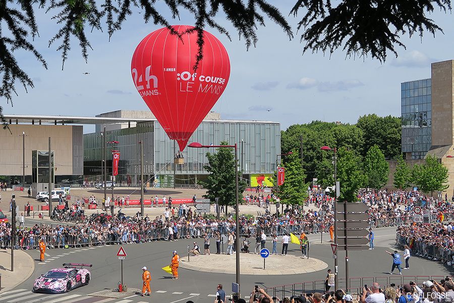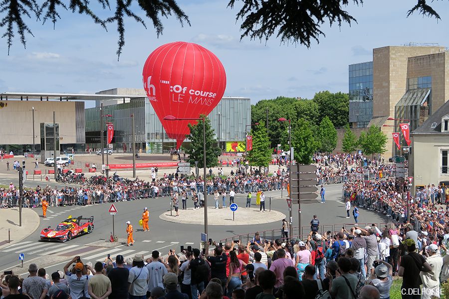 Depuis l’année dernière, une quinzaine de bolides grondent dans la ville entre une haie de spectateurs. C’est la nouvelle attraction imaginée par l’A.C.O., et elle se déroule après le Pesage. La montée du tunnel sous le 'Vieux Mans' ne manque pas d’intérêt au niveau phonique…
