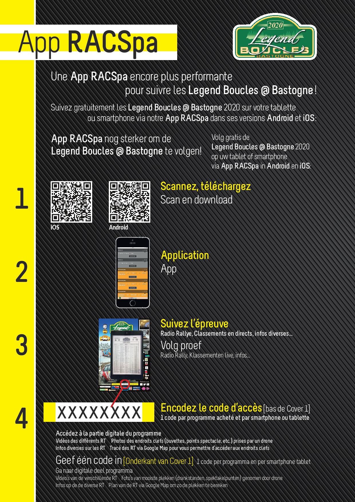 Si les Legend Boucles @ Bastogne constituent la crème des épreuves réservées aux voitures anciennes, elles se distinguent aussi par les moyens toujours plus impressionnants offerts aux suiveurs et aux fans pour ne rien manquer du déroulement de la course. C’est ainsi que l’application RACSpa proposée pour ce millésime 2020 est encore plus performante que l’année dernière. Sur la première page du programme officiel, vendu dès le vendredi en début de soirée au tarif de 10 euros, un QR Code iOS et Android peut être scanné, de quoi vous permettre de télécharger l’application. Il vous est alors possible de suivre le déroulement de l’épreuve via la radio officielle, de consulter les classements, infos diverses, etc. Mais ce n’est pas tout !