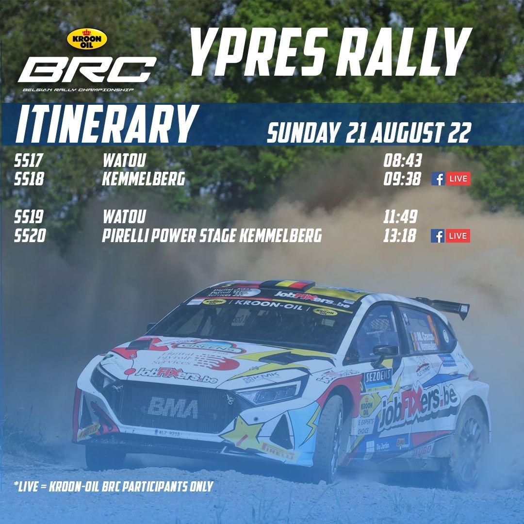 Quatre spéciales seront encore disputées le dimanche, avec deux boucles de deux spéciales. (Watou et Kemmelberg). L’emblématique chrono de Kemmelberg sera le décor des deux BRC Live Shows, programmés à 9h30 et 13h45.