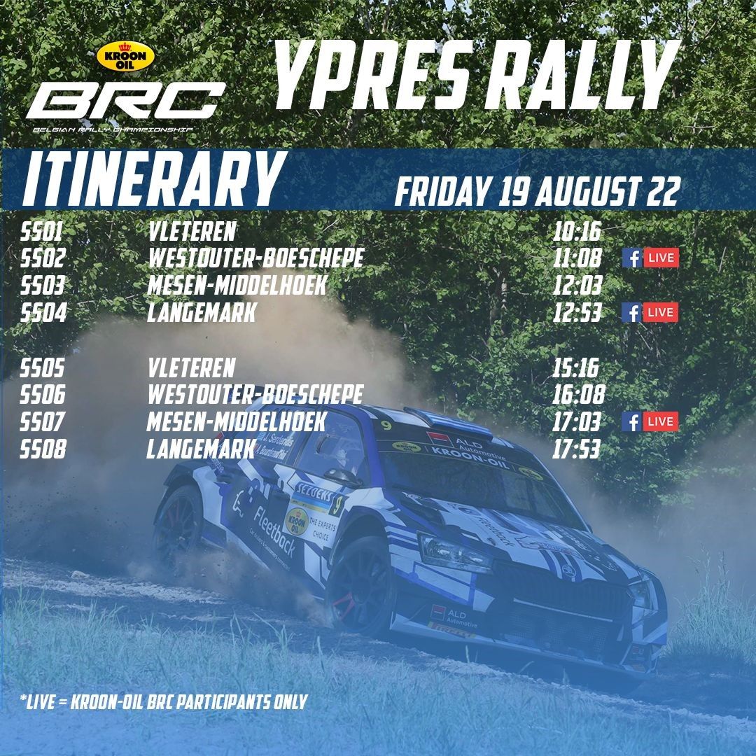 Vendredi, deux boucles de 4 spéciales sont au programme : Vleteren (11,97 km), Westouter-Boeschepe (19,60 km), Mesen-Middelhoek (7,99 km) et Langemark (8,95 km). Lors de trois BRC Live Shows, nous proposerons depuis les spéciales des images d’action des animateurs du Kroon-Oil BRC, mais aussi des interviews à l’arrivée et les analyses des chronos par nos présentateurs Gert Vermersch (vendredi et samedi), Hugo Van Ostal (dimanche) et votre serviteur (les trois jours). Le premier direct débutera à 11h35, depuis l’ES 2, Westouter. Suivront ensuite l’ES 4 (Langemark) à 13h30, et aux alentours de 17h35 le troisième BRC Live Show depuis l’ES 7, Mesen.