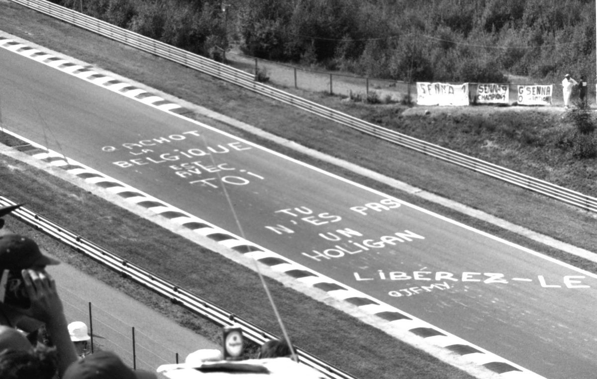 Dans notre série des inoubliables histoires en lien avec le Circuit de Spa-Francorchamps, impossible de passer sous silence le cas Bertrand Gachot, grand absent du Grand Prix de Belgique 1991. Et pour cause, le Franco-Belge - ou Belgo-Français, selon la direction du vent - était... en tôle à cette époque ! S'en est suivi un mouvement de solidarité peu habituel, les proches du pilote Jordan en F1, mais aussi d'innombrables supporters, faisant savoir tout le bien (well...) qu'ils pensaient de la justice britannique. Comme on s'en rend compte sur ces photos de George de Coster, le bitume de Francorchamps avait même pris des airs de Nordschleife sur quelques mètres, tandis que Pascal Witmeur, grand ami de Gachot, qui tenta sa chance en Formule 3000 à Spa cette année-là, arborait sur sa monoplace de grands slogans demandant la libération de l'infortuné pilote.