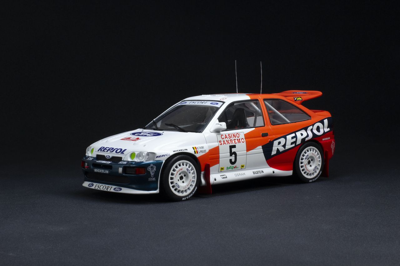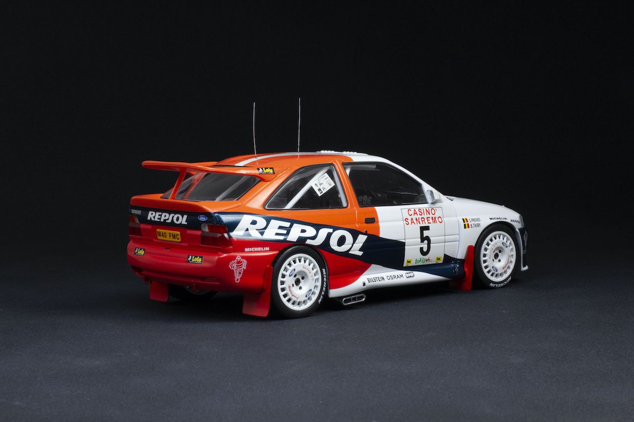 Ce modèle, c’est la Ford Escort RS Cosworth #5 “Repsol” de Bruno Thiry et Stéphane Prévot au Rallye Sanremo 1996. Lors de cette épreuve, Bruno et Stéphane s’étaient offert un podium derrière Colin McRae (Subaru) et leur équipier Carlos Sainz, devançant aussi un certain… Freddy Loix, quatrième avec sa Toyota.