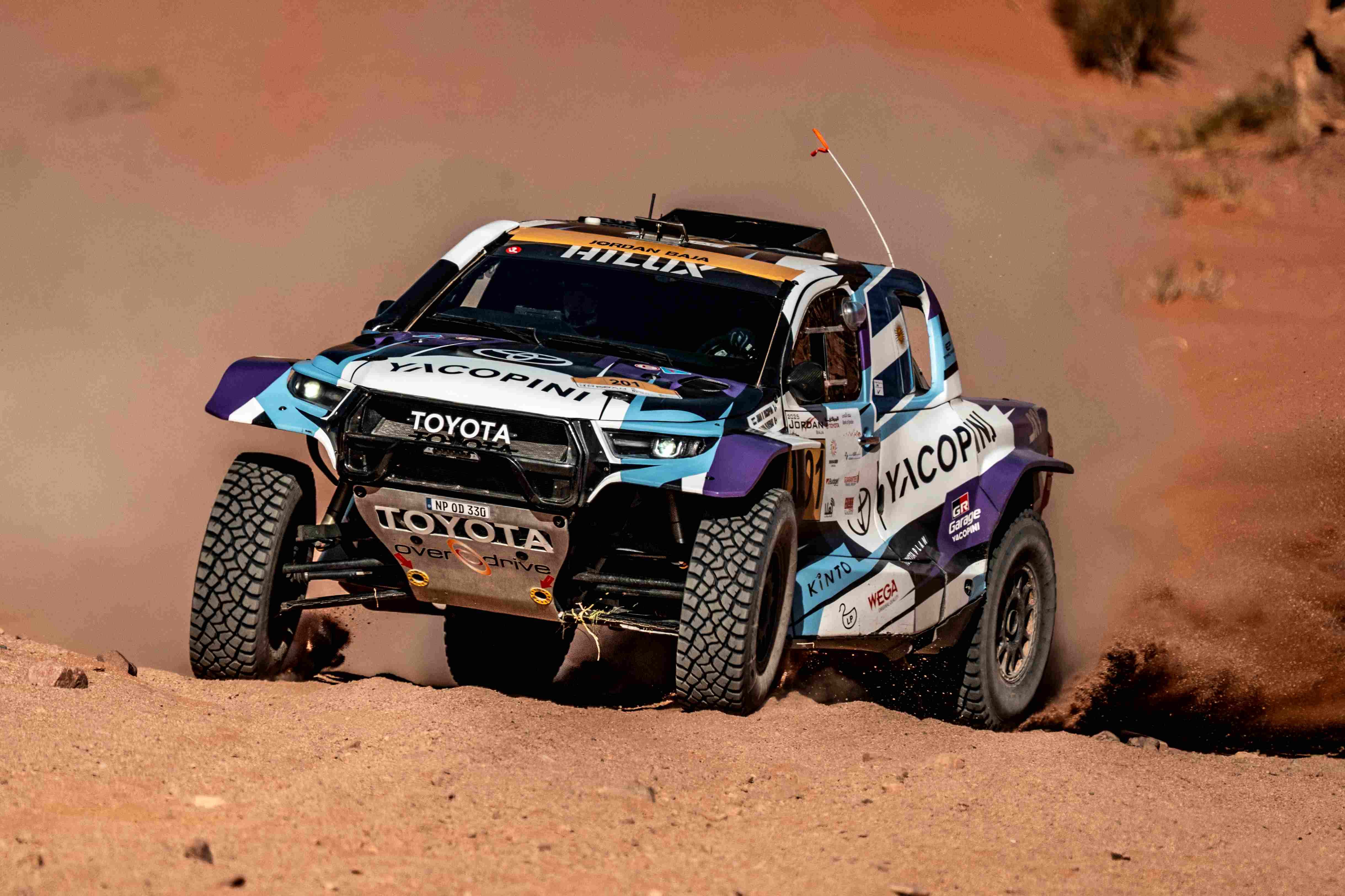 La série de succès d'Overdrive Racing sur la scène des rallyes-raids et autres bajas se poursuit, avec le week-end dernier la victoire de l'Argentin Juan Cruz Yacopini et de son copilote espagnol Daniel Oliveras au terme d'une très difficile Jordan Baja. Les troupes de Jean-Marc Fortin auraient pu réaliser le doublé, face à une concurrence il est vrai réduite, mais Yazeed Al-Rajhi et Timo Gottschalk ont été victimes d'un accident lors de la dernière étape, s'écartant de la trace idéale avant de subir un gros choc dans un trou de sable. Yacopini a donc imposé son Toyota Hilux avec... 10 secondes de bon sur le Taurus T3 Max d'Abdulaziz Al-Qubari, impressionnant d'aisance. (Vincent Franssen / Photo Overdrive Racing)