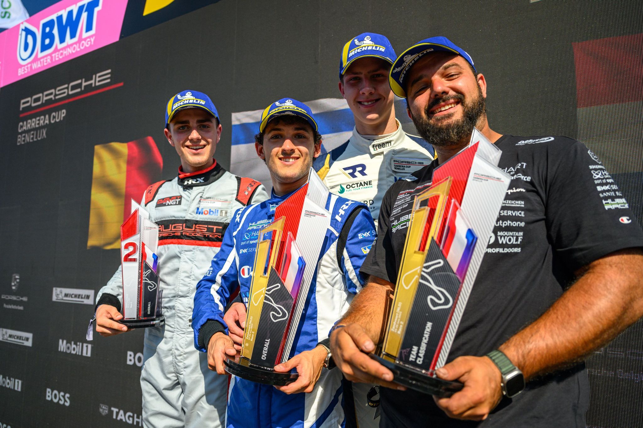 Plutôt que de céder à la déception, Benjamin Paque restait concentré sur son sujet. Objectif : inverser la tendance en Course 2, en toute fin de journée le dimanche, alors qu’il s’élançait depuis la 2ème place sur la grille. "Robert de Haan partait depuis la pole, et très vite, j’ai vu débouler mon équipier chez AUGUST by NGT, Glenn van Parijs, qui joue le titre. Je l’ai laissé filer, et quelques instants plus tard, Van Parijs et de Haan se sont accrochés ! Je me suis donc retrouvé en tête, mais désormais flanqué d’Ariel Levi, qui était clairement plus rapide. Une fois encore, le fait de rouler à la fois en Carrera Cup Benelux et allemande durant le même week-end lui permettait de connaître l’état exact de la piste. Il est parvenu à passer, et dans mon rétroviseur, j’ai vu revenir de Haan et Gus Burton, un Britannique issu de la Porsche Supercup. Il y a eu plusieurs neutralisations via Voiture de Sécurité, et à la troisième relance, mon avantage était réduit à rien. J’ai fermé plusieurs fois la porte, mais de Haan a fini par me pousser en tête-à-queue, avant que Burton ne me percute de plein fouet ! Un pilote PRO-AM a parachevé le travail en me touchant de face, ce qui a abîmé le radiateur. J’étais dégoûté… Avec le team, nous avions tout mis en place pour réaliser une bonne course, ce que nous étions clairement en train de faire…"