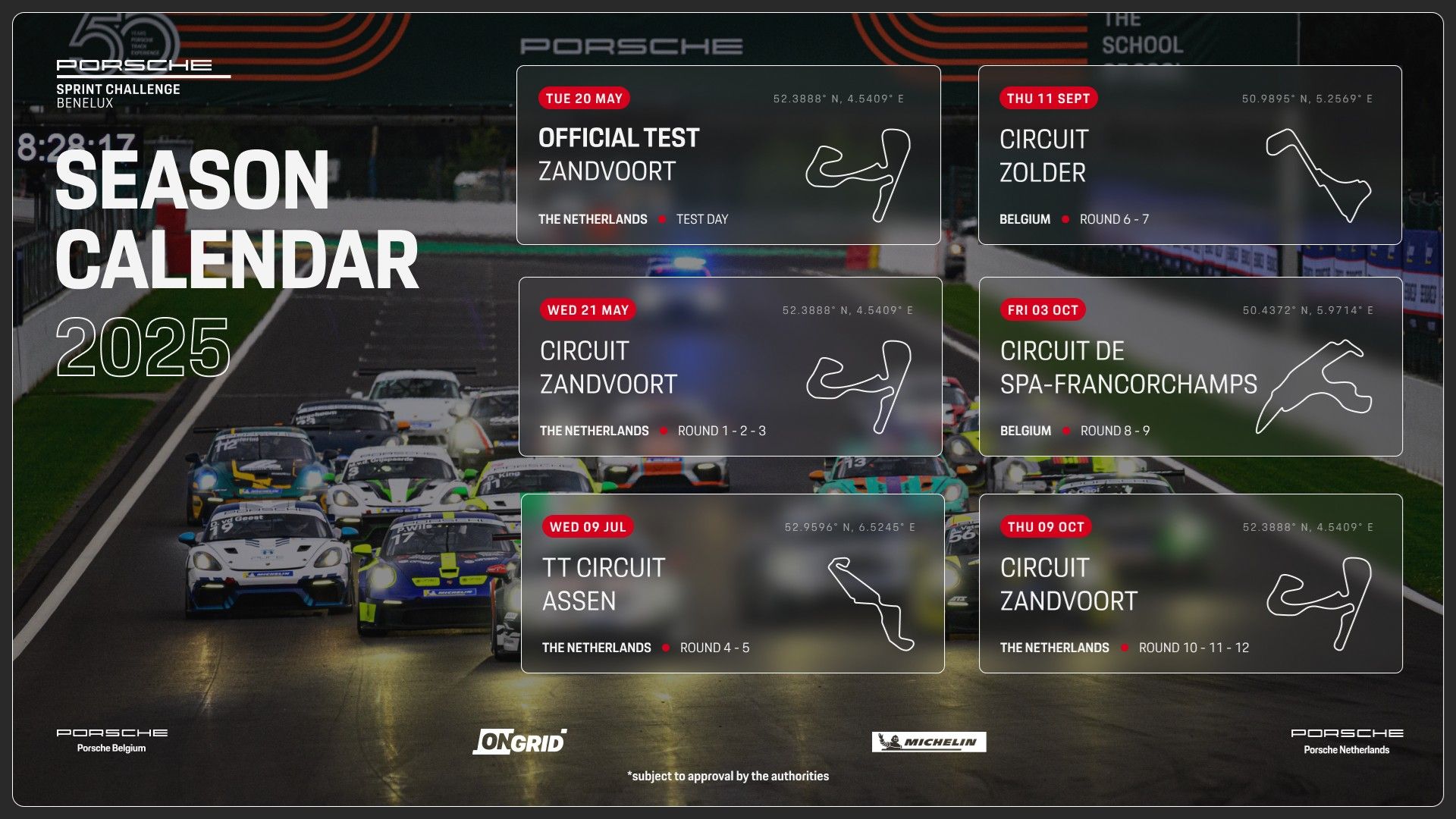 Les fondamentaux du Porsche Sprint Challenge Benelux resteront les mêmes en 2025. La compétition pour les entrepreneurs pratiquant la course automobile et les jeunes talents consistera en une journée de test et cinq meetings, chaque fois sur une seule journée et en semaine pour ce qui est de l’activité sportive. La compétition sera ouverte à différents modèles de Porsche, en l’occurrence la Porsche 911 GT3 Cup – Types 991 et 992- et la Porsche 718 Cayman GT4 Clubsport.