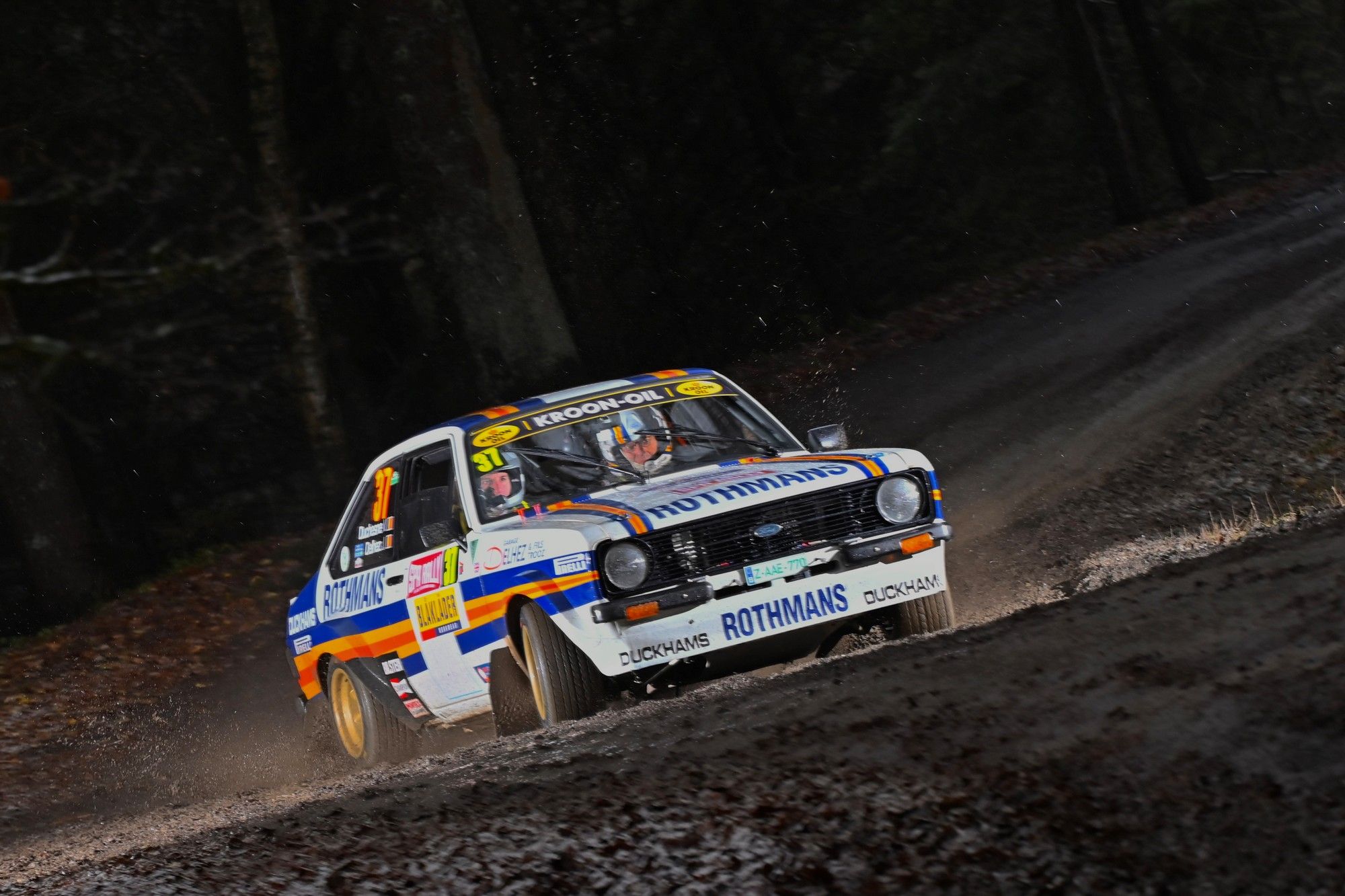 Parmi les faits d'armes des deux premières spéciales du Spa Rally, on pointe les ennuis de Johnny Delhez et Vincent Duschesne (Escort Mk2) en Historic BRC. L'agent Ford de Trooz a en effet crevé dans la partie finale de l'ES1 Ster, laissant la bagatelle de 9'26" dans la mésaventure ! Résultat : la très belle Escort aux couleurs de Rothmans est reléguée dans les profondeurs du classement. C'est Geoffrey Leyon (Escort Mk1) qui mène logiquement la danse avec 27 secondes de bon sur Rainer Feltes (Escort Mk2) et près d'une minute sur Raphaël Beaufort (Escort Mk2). (Vincent Franssen / Photo Mathieu)