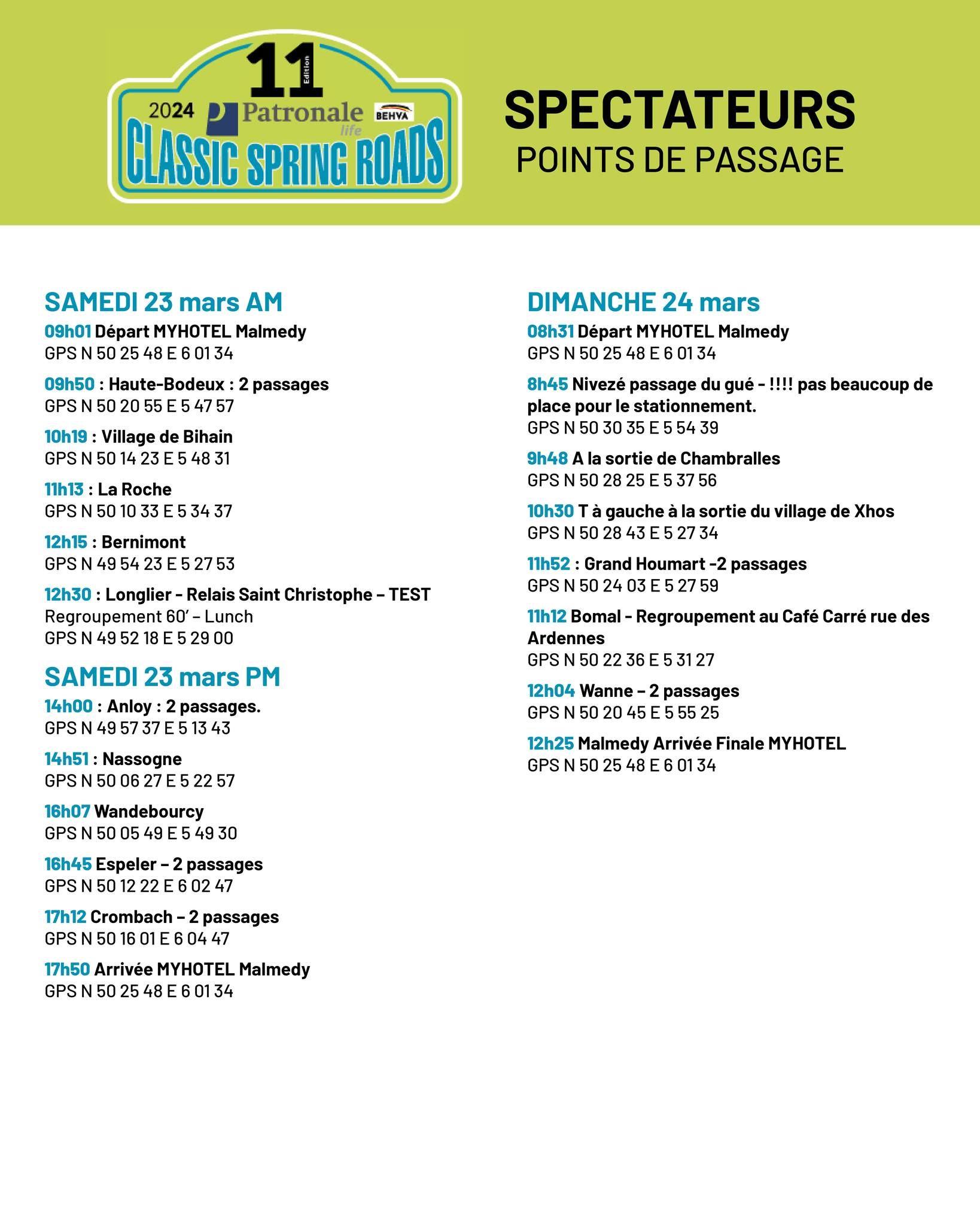 Comme annoncé durant la semaine, il sera possible de voir passer la cinquantaine de voitures alignées aux Classic Spring Roads 2024 en différents endroits, réunis dans le document en pièce jointe. Et Speed Action vous tiendra évidemment au courant de l'évolution de l'épreuve, avec dès samedi soir le classement final de la catégorie 'One Day', qui rassemblera de nombreux cadors de la régularité sur route ouverte... (Vincent Franssen)