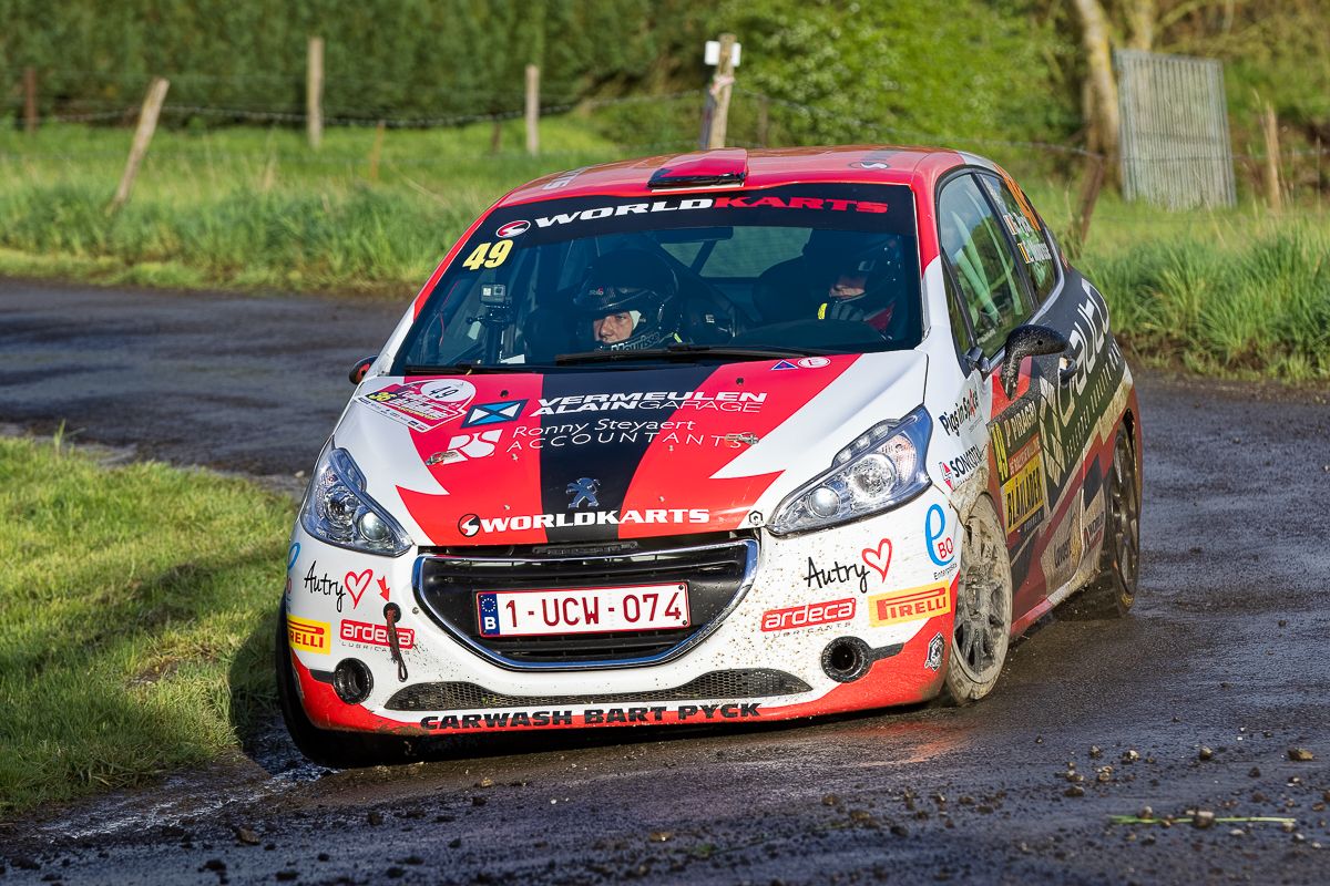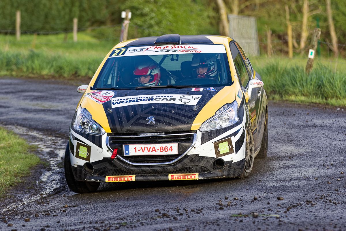 Valentin Vertommen avait certaines ambitions au départ sur sa Ford Fiesta R2T, disputant l’épreuve pour la deuxième fois, mais il devait baisser le rythme en raison de la pluie : "Je manque de confiance et d’expérience sous la pluie. C’est dommage car je suis sûr que j’aurais pu être bien plus proche sur le sec." Glenn Snaet ne connaissait pas la réussite. Samedi matin, il sortait en effet violemment de la route dans la spéciale de Natoye, sur le même freinage qui avait surpris un peu plus tôt David Bonjean. Heurtant une maison, la Peugeot de Glenn Snaet était durement endommagée. (Vincent Franssen & Com / Photos Pascal Verheuge)