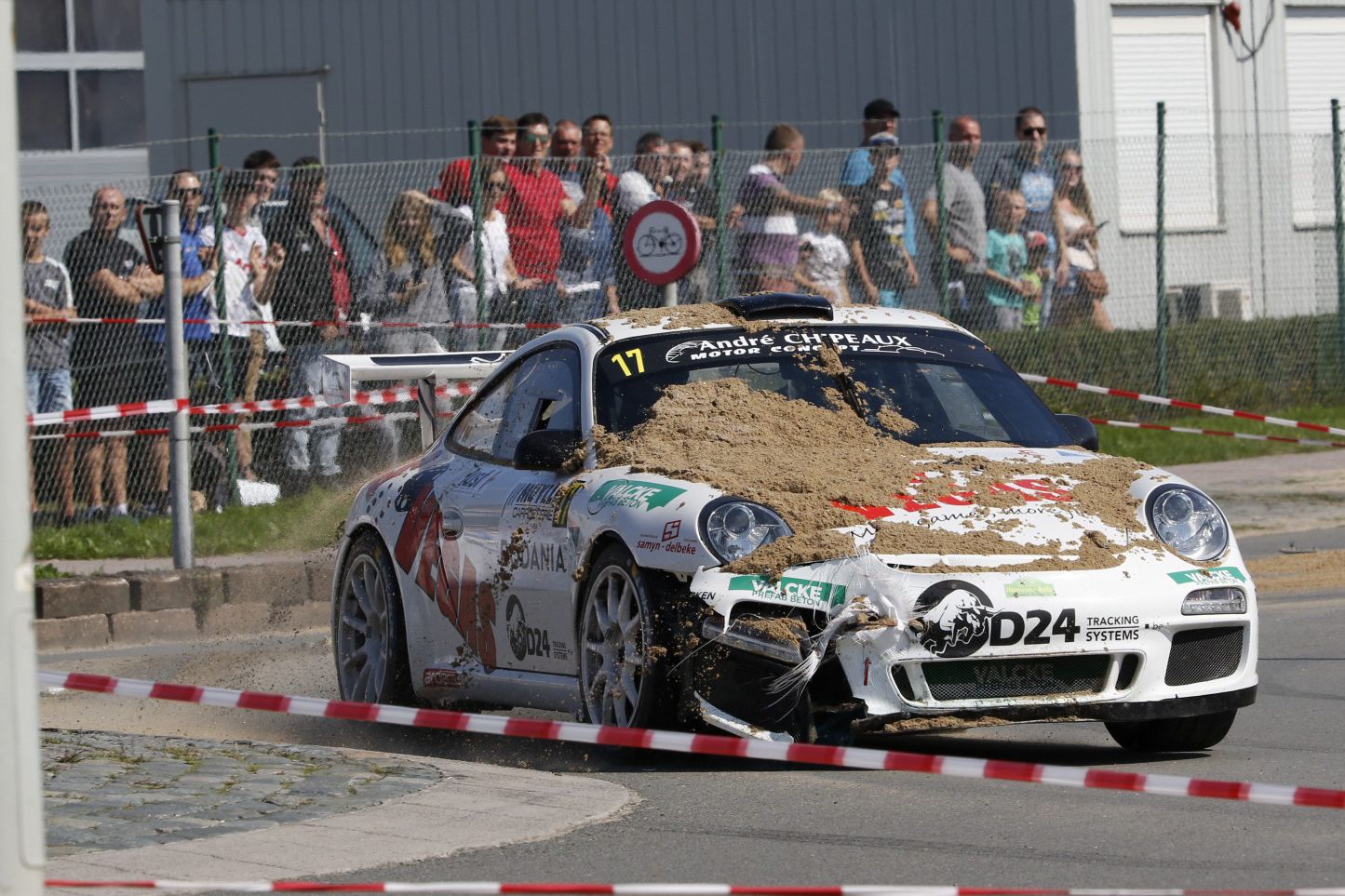 Le deuxième passage du jour dans le Zoning a fait pas mal de dégâts du côté de l'Omloop van Vlaanderen. La Mitsubishi Lancer Evo de Coene est en effet restée sur le carreau après avoir tapé, au même titre que l'Opel Manta 400 de l'incontestable leader en Historic BRC, Paul Lietaer, abîmé au niveau de l'aile arrière-gauche, et finalement contrainte d'en rester là sur bris de pont. Frayeur également pour la Porsche 997 GT3 #17 de Delplace, qui n'a pu éviter l'impact avec un sac de sable, comme l'illustre la photo de Pascal Verheuge. Un incident qui a en fait répandu du sable sur la route, et entraîné la perte d'adhérence de la Mitsuhishi et de la Manta 400.