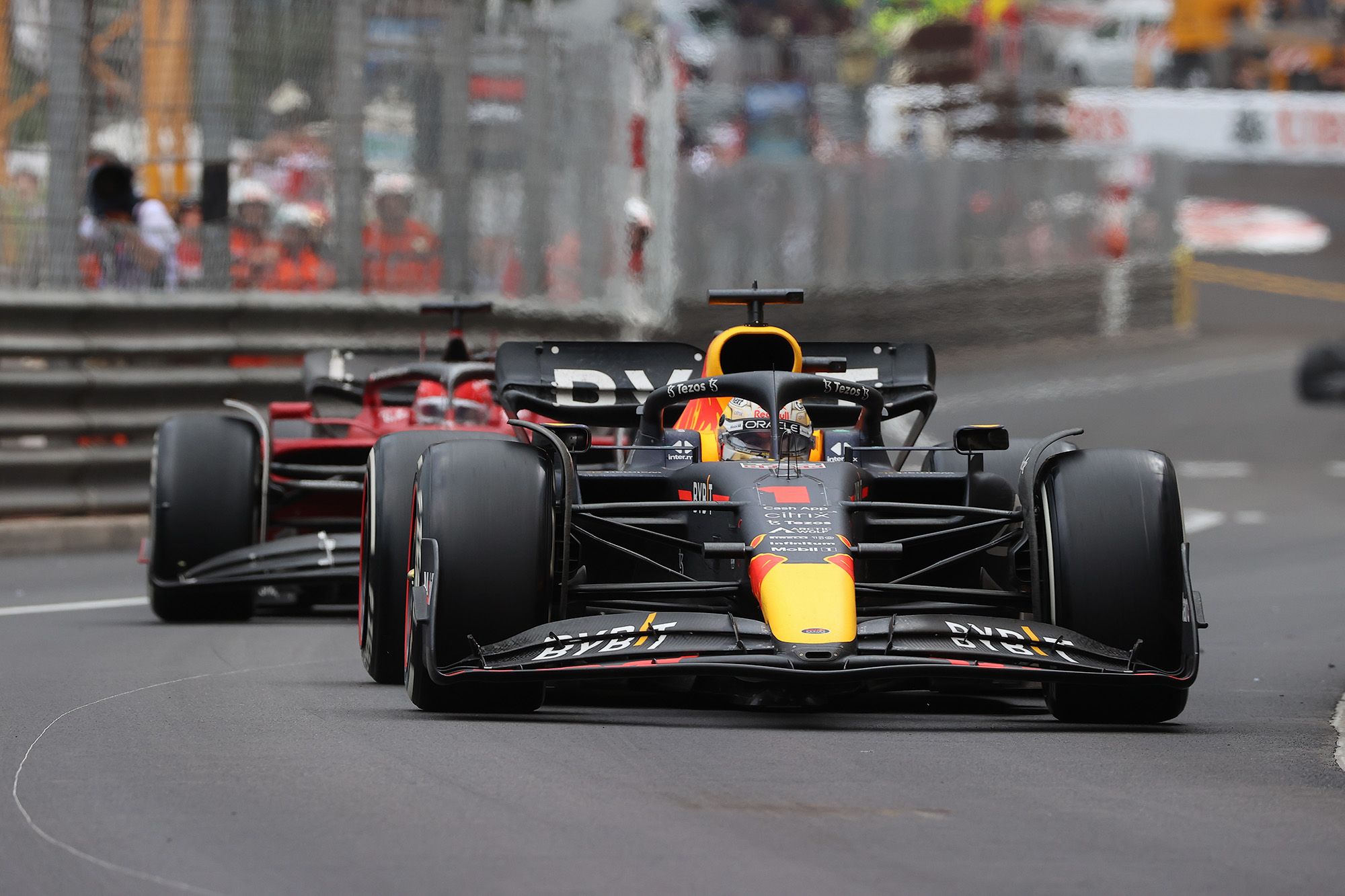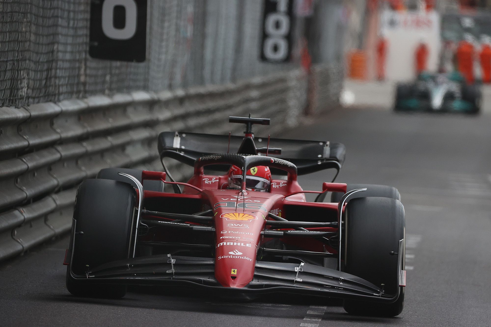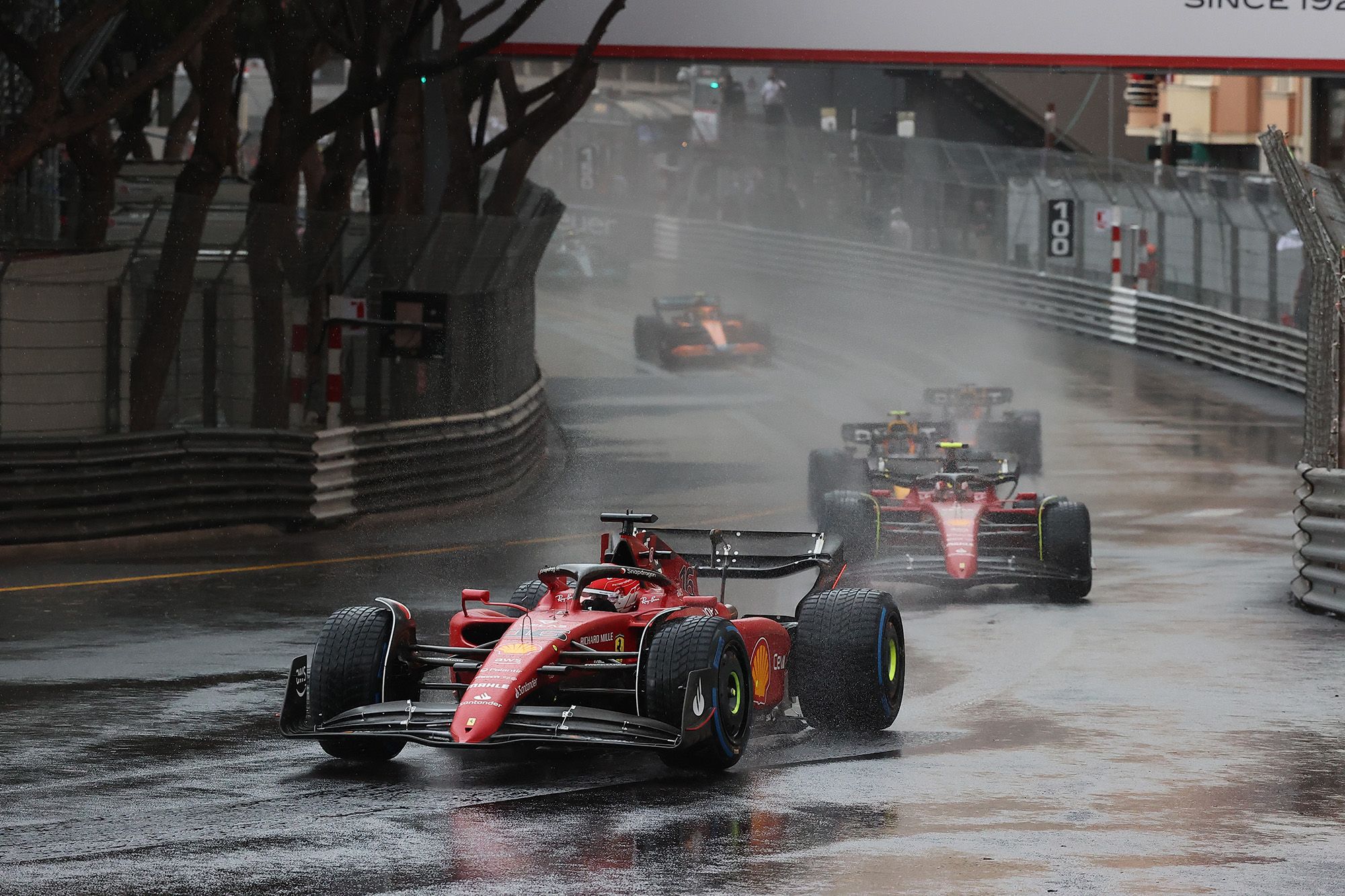 Il a fallu attendre longtemps pour voir le Grand Prix de Monaco 2022 enfin lancé. Et pour cause, une grosse averse tombait à l’approche du départ. Après avoir retardé la procédure d’un quart d’heure, les pilotes effectuaient deux tours de formation au ralenti derrière la Safety-Car, et se rendaient à l’évidence : c’était impraticable. C’est seulement à 16h05, soit 65 minutes après l’heure prévue, que les pilotes reprenaient la piste pour deux nouveaux tours de chauffe… qui voyaient Stroll (Aston Martin) puis Latifi ((Williams) taper le rail ! Le départ était donné lancé sans aucune modification pour les 10 premiers, dans l’ordre Leclerc (Ferrari) – Sainz (Ferrari) – Perez (Red Bull) – Verstappen (Red Bull)– Norris (McLaren) – Russell (Mercedes) – Alonso (Alpine) – Hamilton (Mercedes) - Vettel (Aston Martin) et Ocon (Alpine).