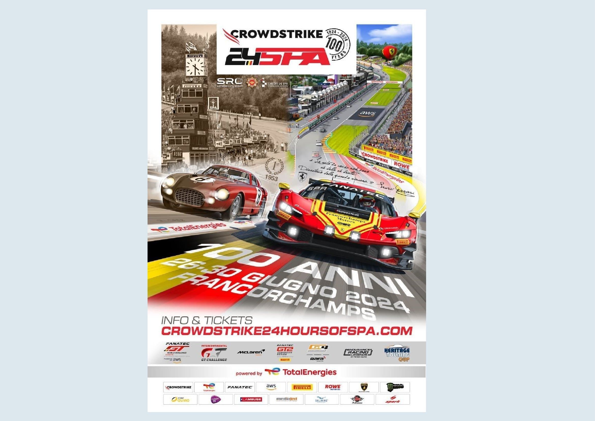 "Le auto da corsa non sono né belle né brutte. Diventano belle quando vincono." Cette déclaration d’Enzo Ferrari, que l’on pourrait traduire par "Les voitures de course ne sont ni belles ni laides. Elles deviennent belles quand elles gagnent" apparait au pied du célèbre Raidillon sur le cinquième des dix posters collector annonçant l’édition du centenaire des CrowdStrike 24 Hours of Spa. Vous l’avez compris, c’est le cheval cabré qui est mis à l’honneur sur cette nouvelle affiche à la gloire de l’un des constructeurs les plus prestigieux de la planète.