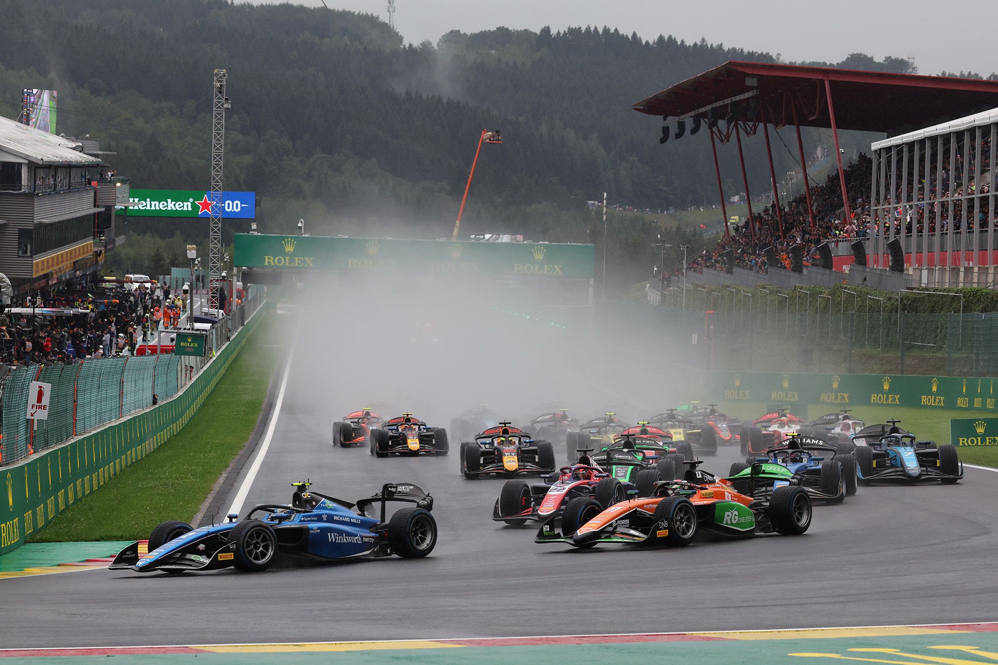Il fallait être patient pour assister à la course sprint de F2 ce samedi sur le Circuit de Spa-Francorchamps. Programmée à 14h15, le départ de la course a en effet été décalé à 18h15 en raison des conditions atmosphériques. Encore fallait-il que la météo soit clémente ! Et justement, les conditions incitaient la direction de course à retarder le départ de 10 minutes supplémentaires. Avec O’Sullivan (Art GP) et Hauger (MP Motorsport) en première ligne, et Amaury Cordell (Hitech) finalement en 10ème position après la pénalité infligée à Aron (Hitech). Et tout le monde en pneus pluie.