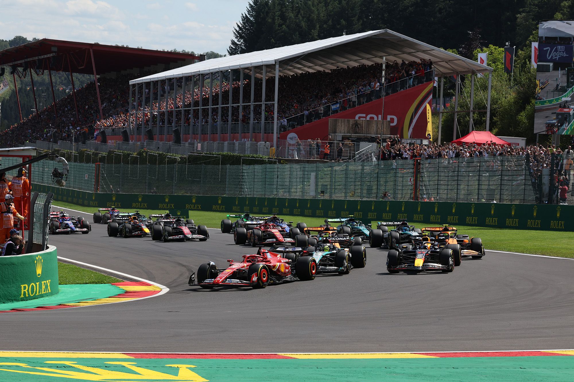 Après la pluie des qualifications, le soleil était au rendez-vous du Grand Prix de Belgique 2024. De quoi permettre un départ sans histoire pour la totalité des pilotes. Leclerc (Ferrari) partait bien, mais Hamilton (Mercedes) mieux encore, qui parvenait à déborder Perez (Red Bull), parti en première ligne. Mieux pour le Britannique, il parvenait à rester dans le sillage de la Ferrari avant de prendre la tête au 4ème tour.